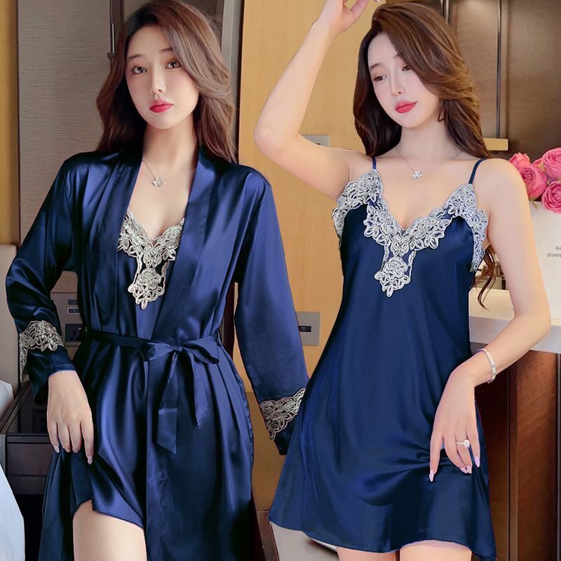 冰丝吊带睡裙睡袍两件套纯欲长袖 薄款 轻奢仿丝性感睡衣女夏款 新款