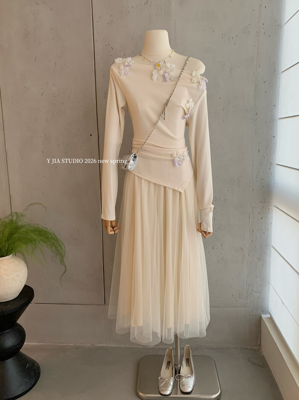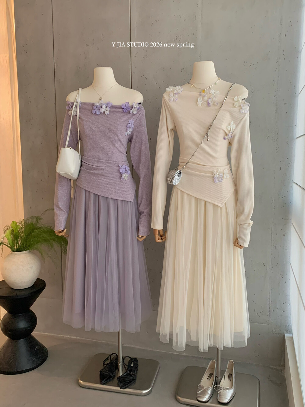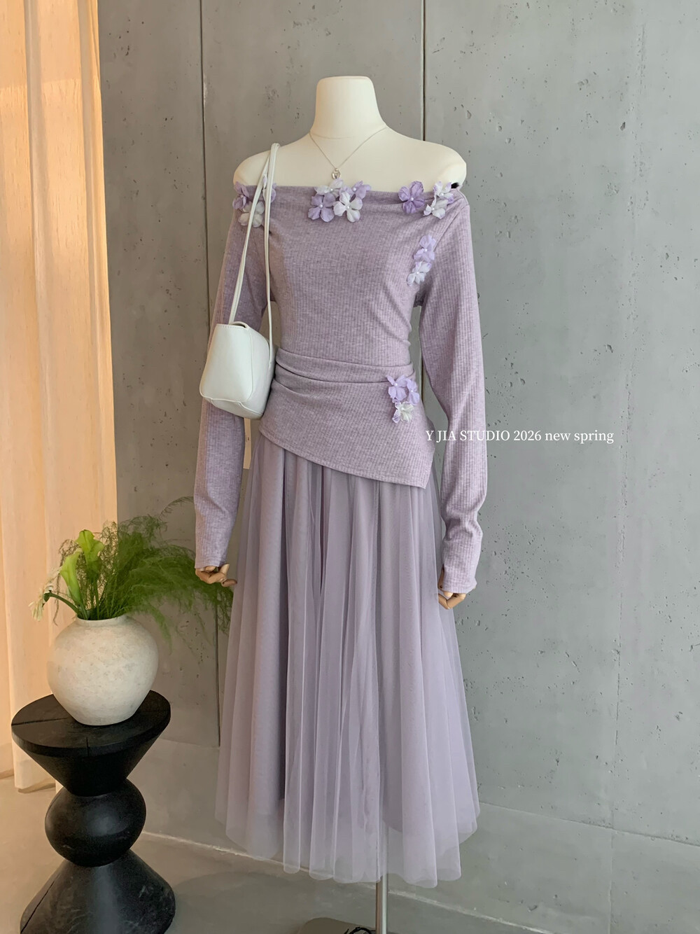 女 高腰A字半身纱裙套装 Y.JIA 伊嘉早春设计感立体花朵一字肩上衣
