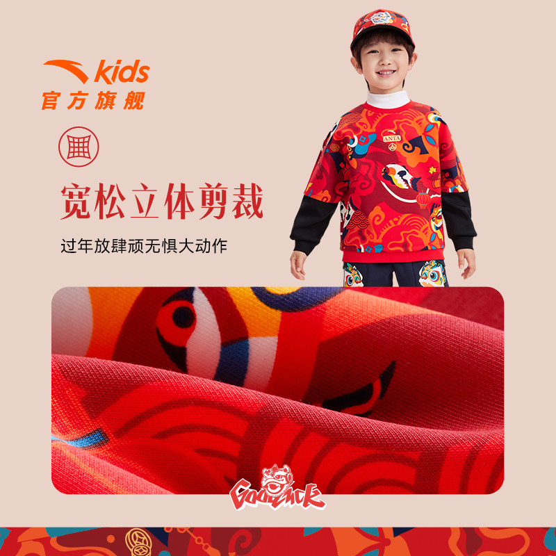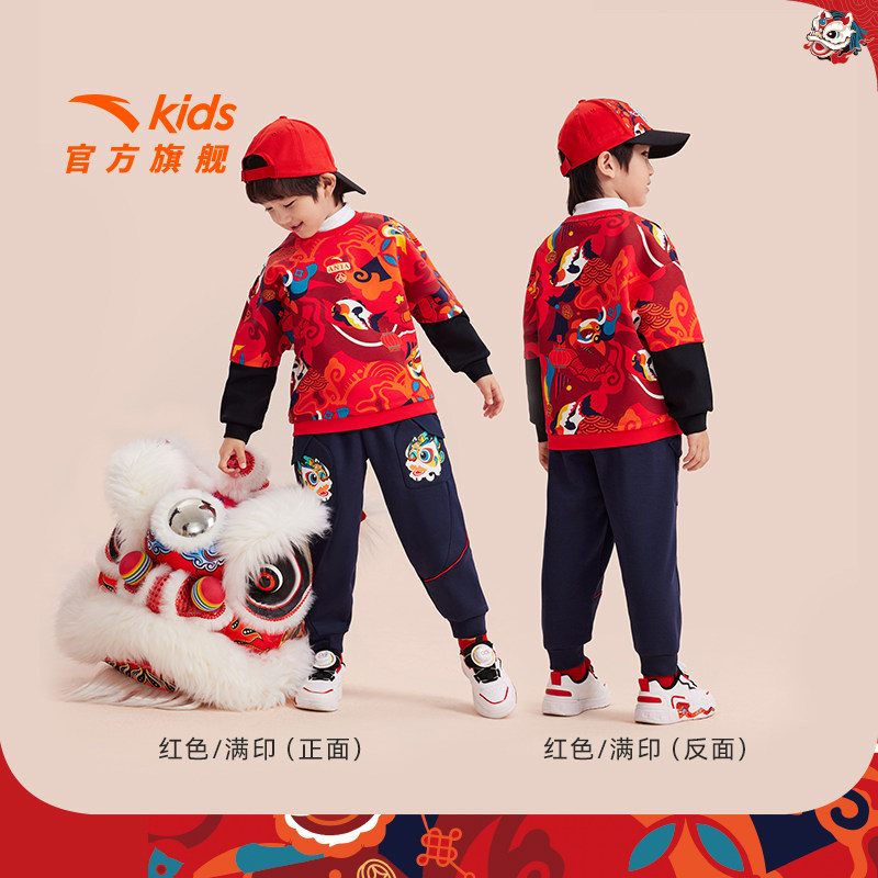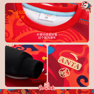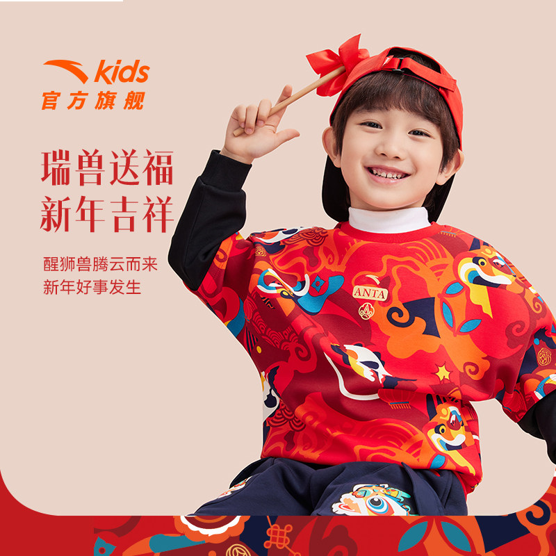 安踏儿童卫衣男童宝宝红色印花套头衫 拜年服 喜庆上衣 新年款