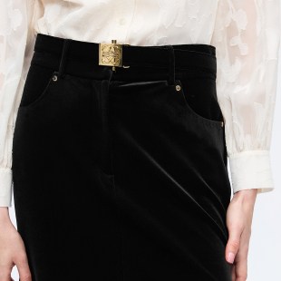 朗姿丝绒老钱风黑色半身裙女长款 通勤高级感半裙2025年