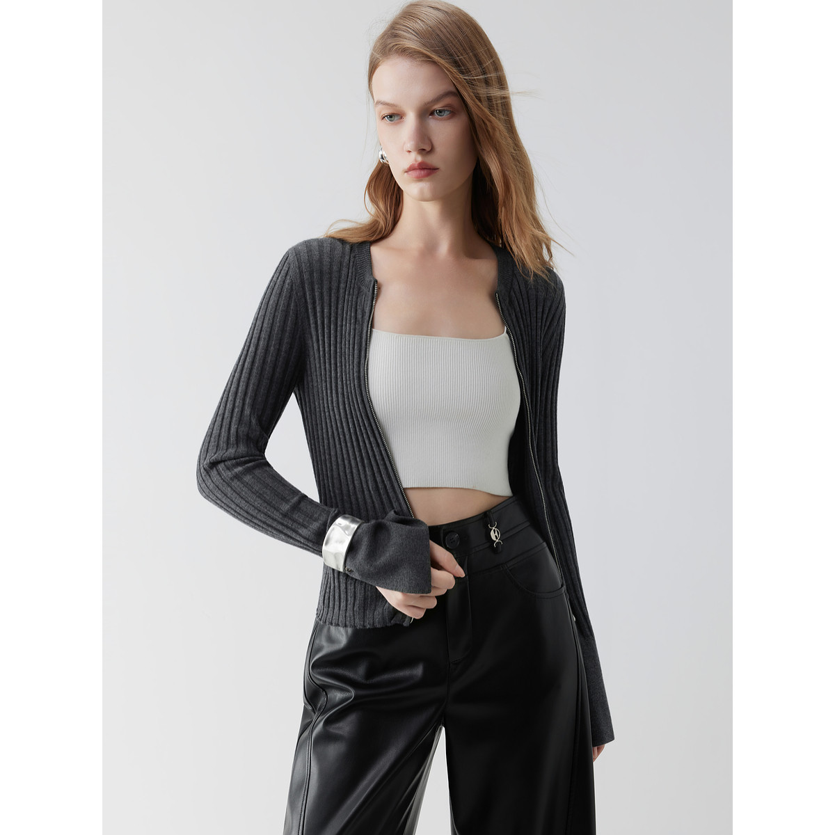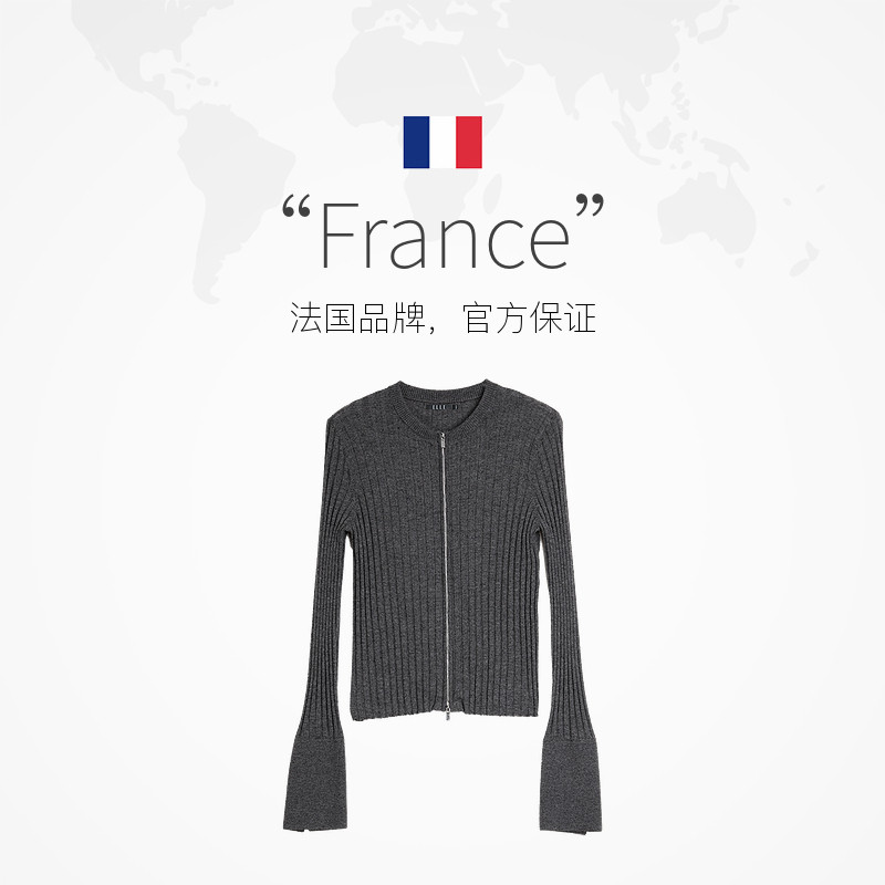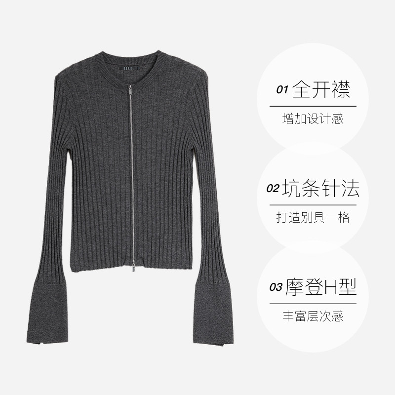 女2025秋款 针织开衫 ELLE深灰色绵羊毛修身 双拉链气质毛衣 自营
