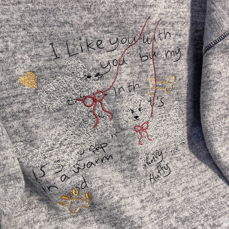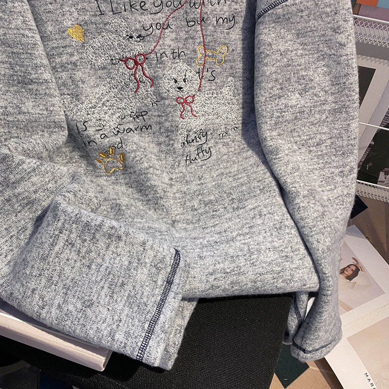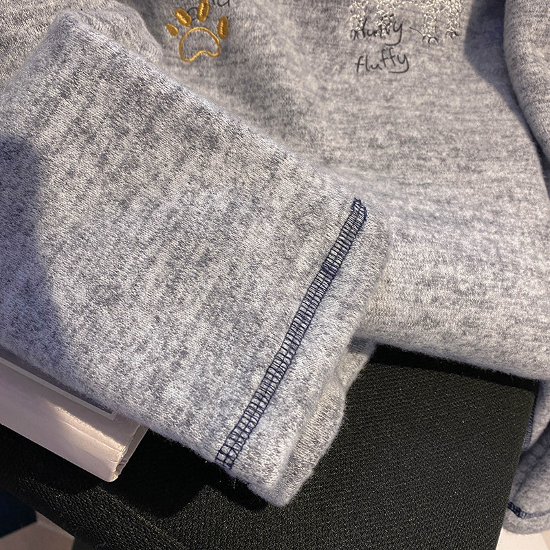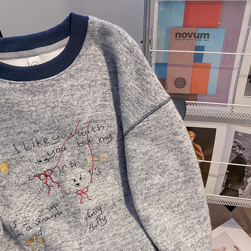 2026年春秋卡通刺绣撞色圆领上衣新竹节棉绒抓毛长袖 女 t恤打底衫