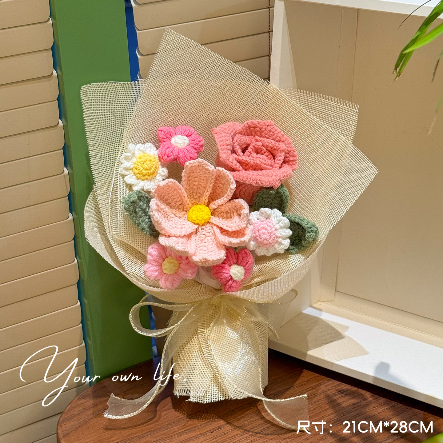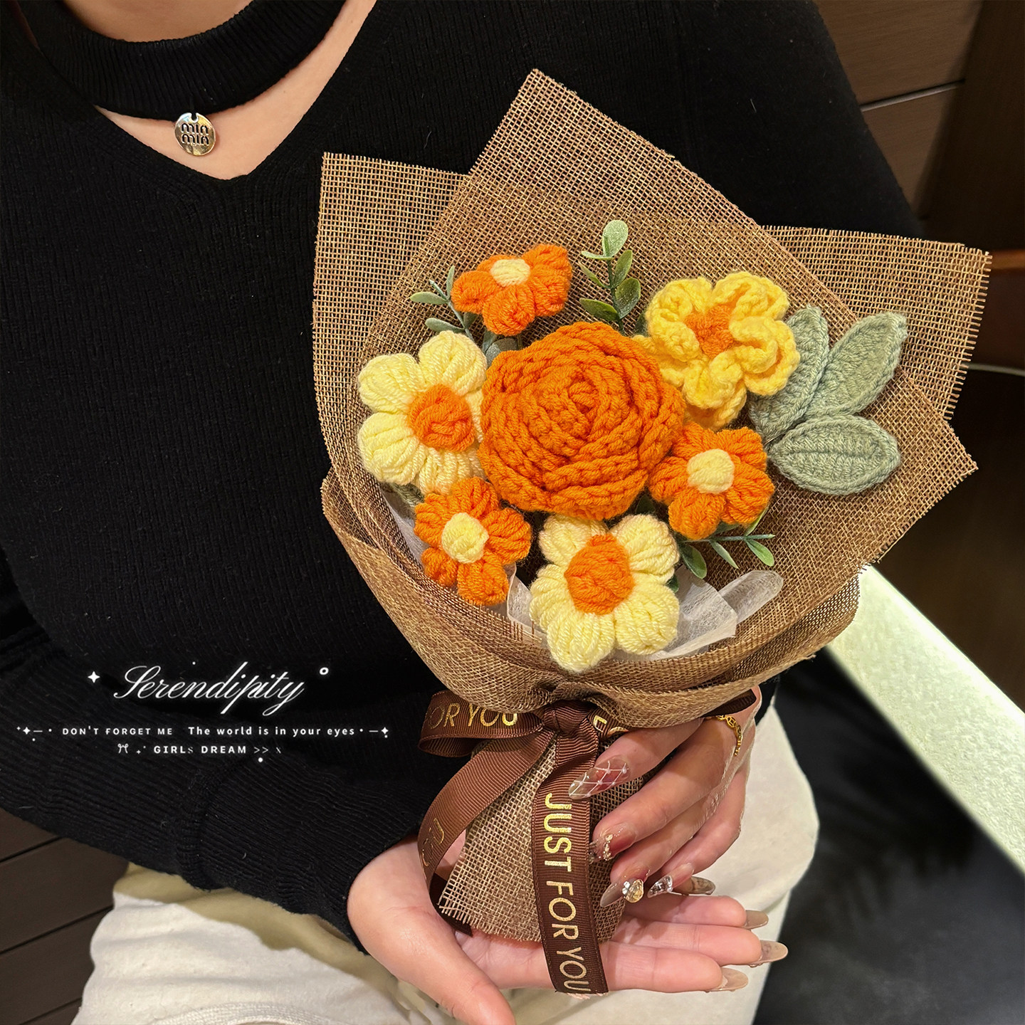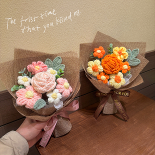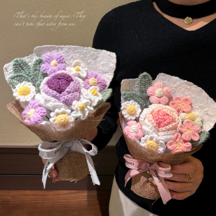 手工针织毛线小花束玫瑰成品仿真花永生花编织礼物手捧花礼盒闺蜜
