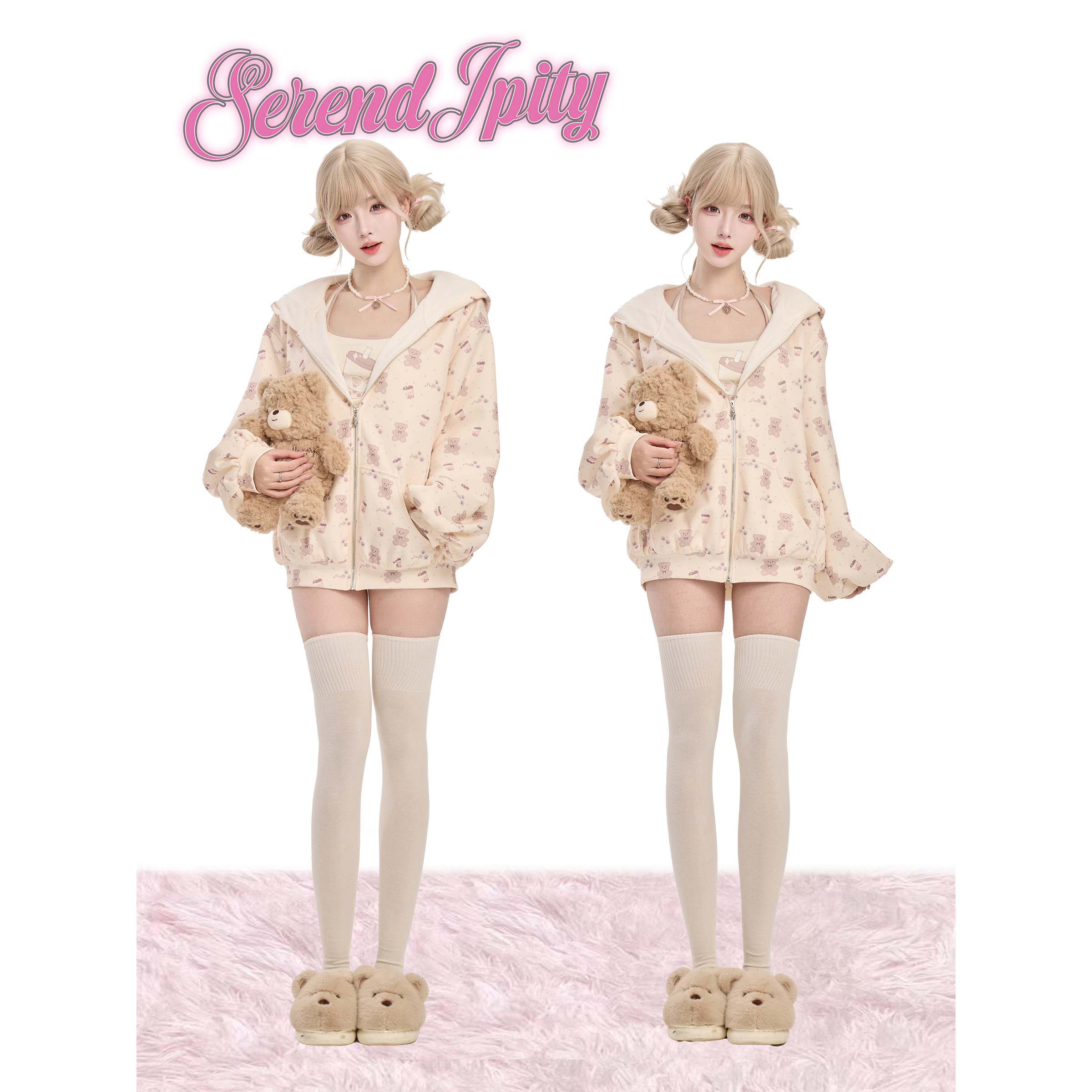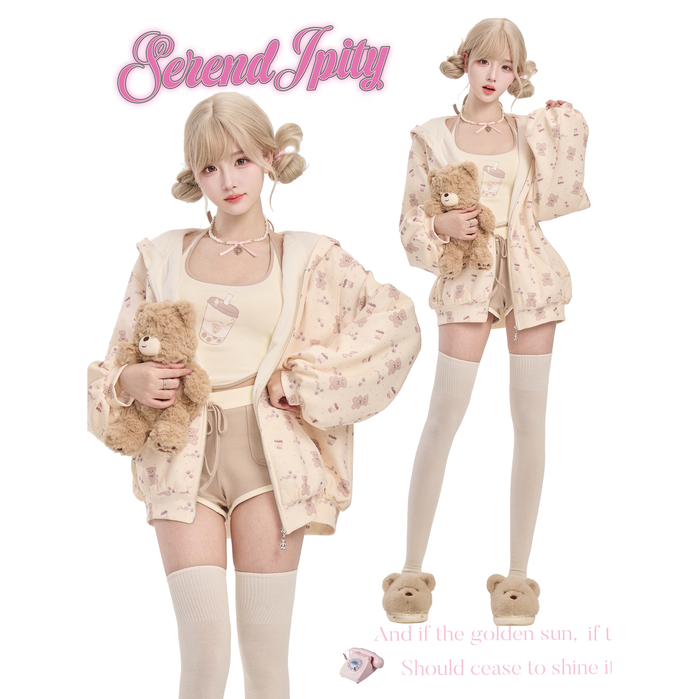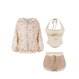 日常系 浅咖短裤 小熊奶茶 杏色印花外套 挂脖吊带 少女椰子
