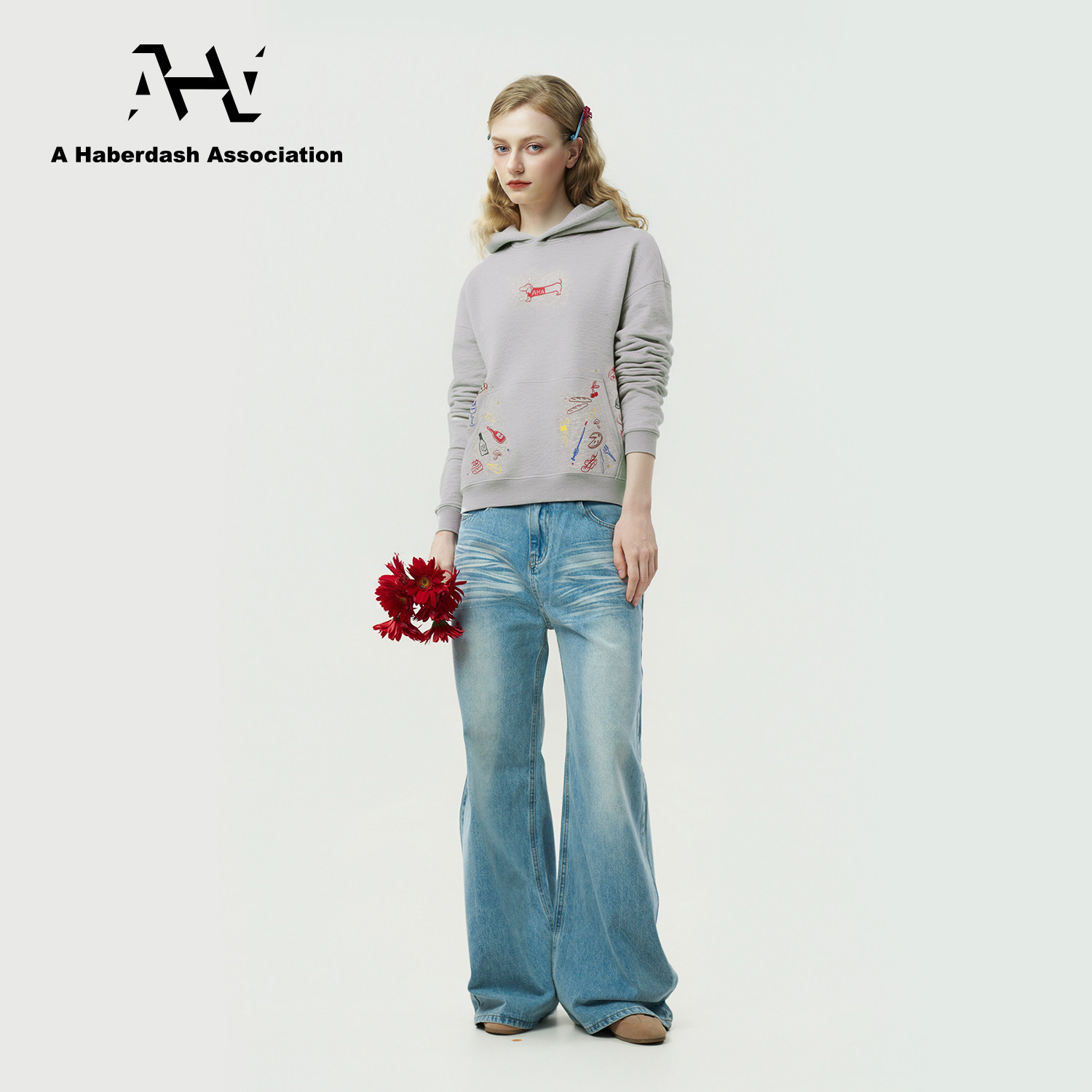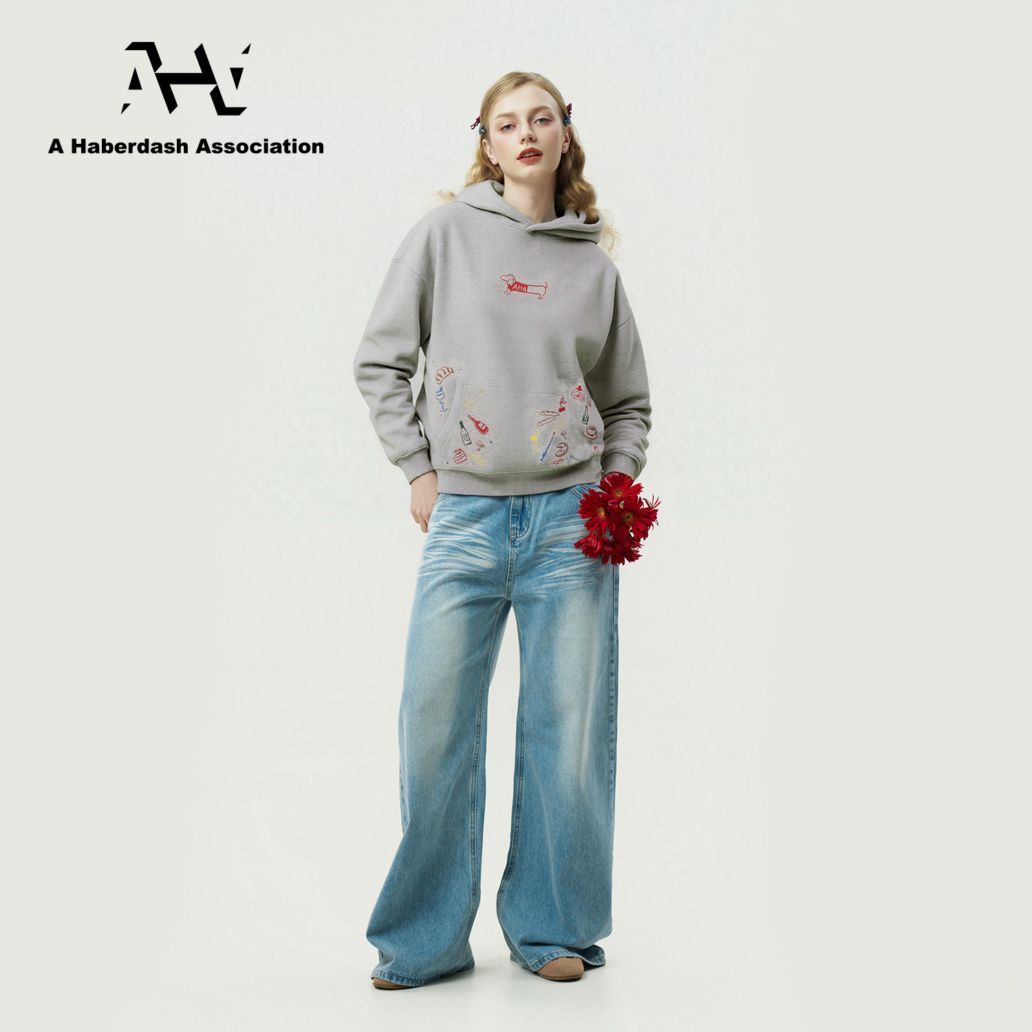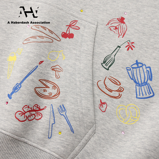AHA爱侈艾·卡通趣味涂鸦印花闪钻25秋冬加绒宽松廓形连帽衫 卫衣