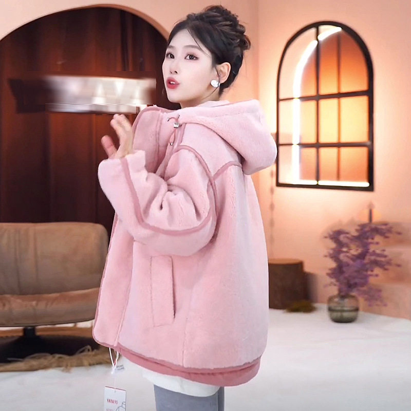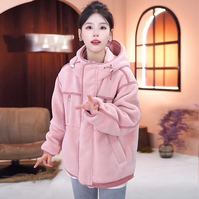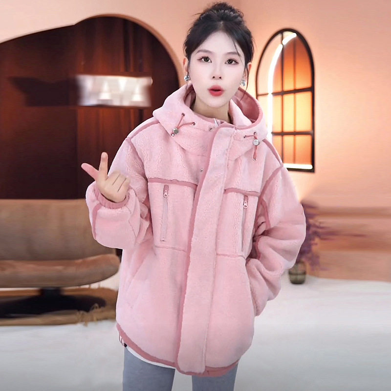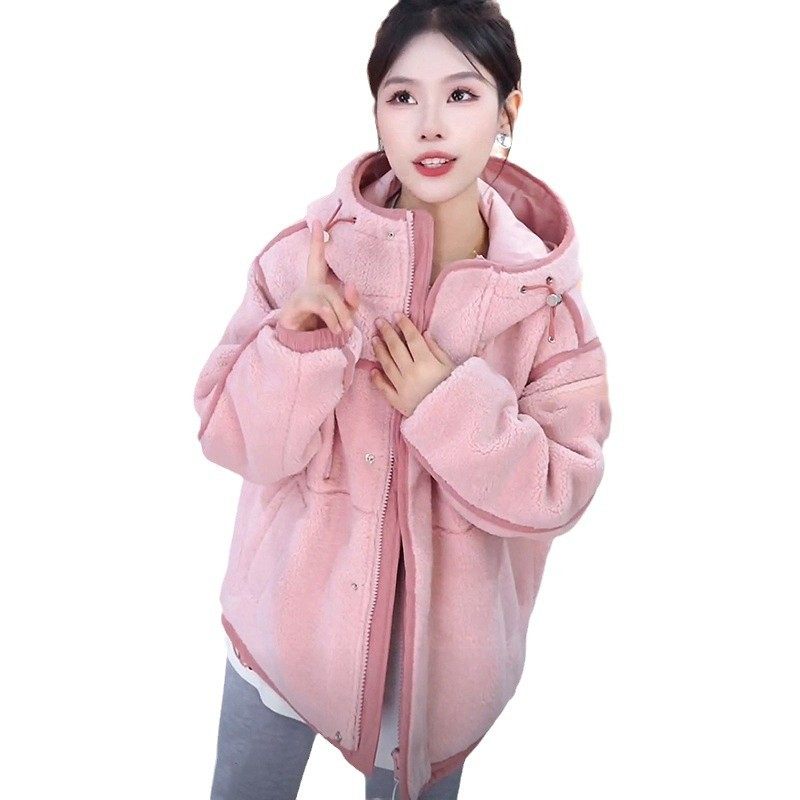 摇粒绒保暖粉色外套女2024冬季 加厚宽松连帽棉服外套小个子 新款