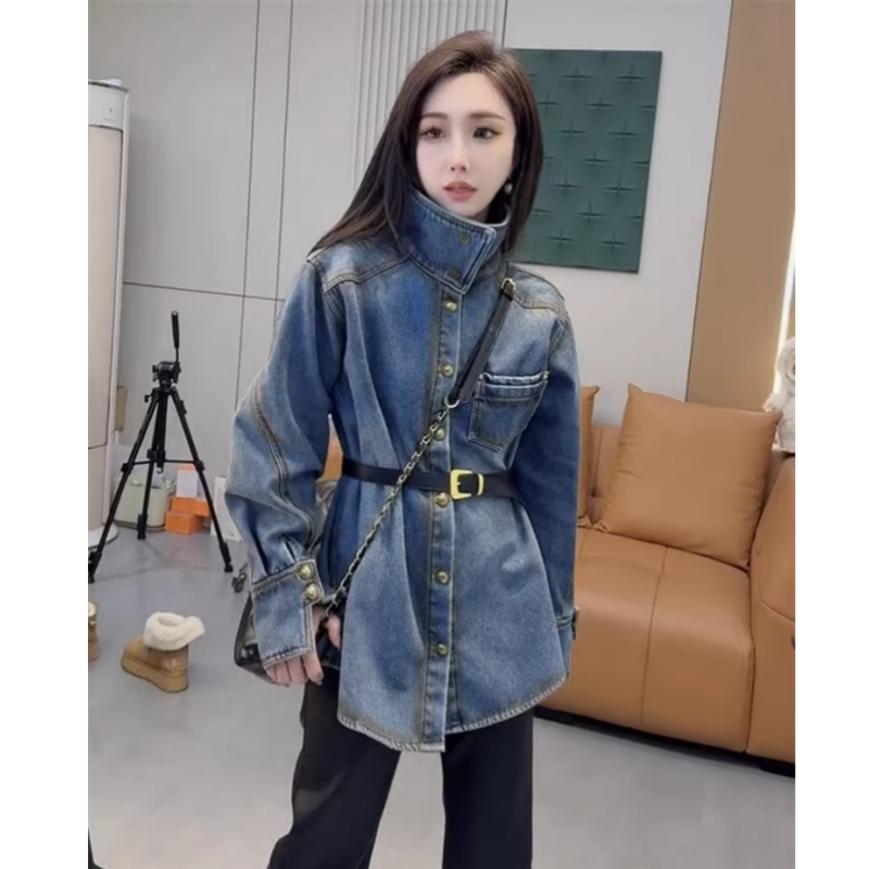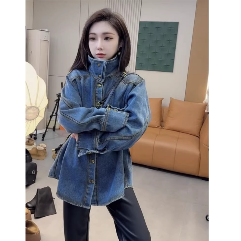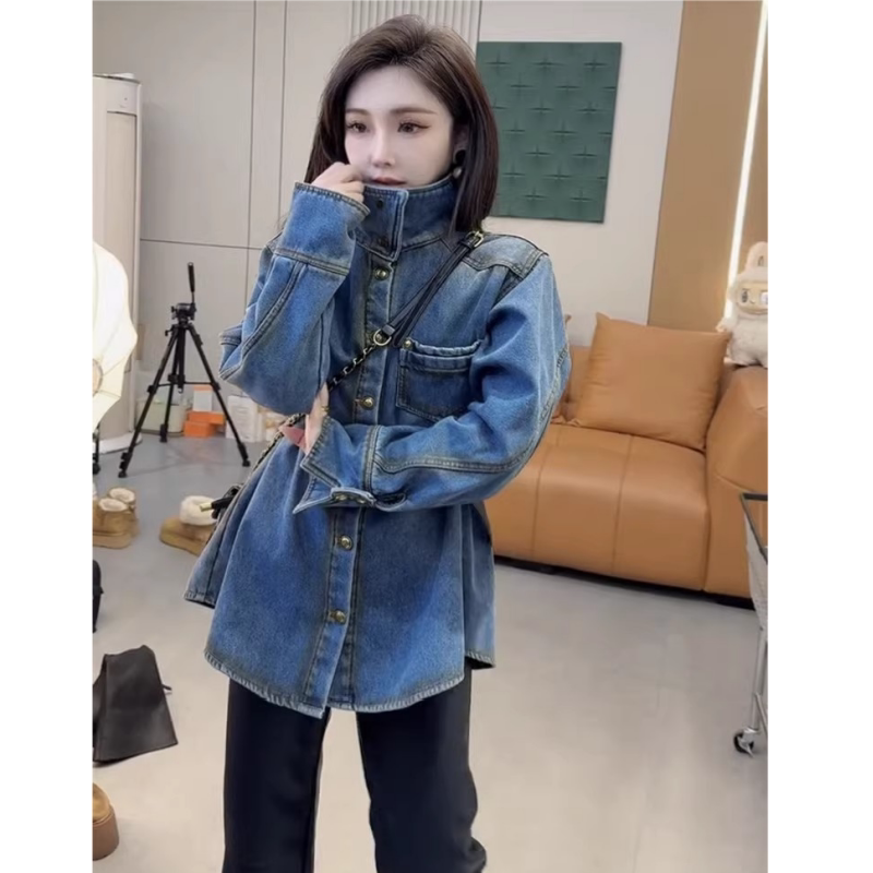 高级复古金属扣加厚衬衫 欧货爆款 重工加绒牛仔外套女2025早春新款