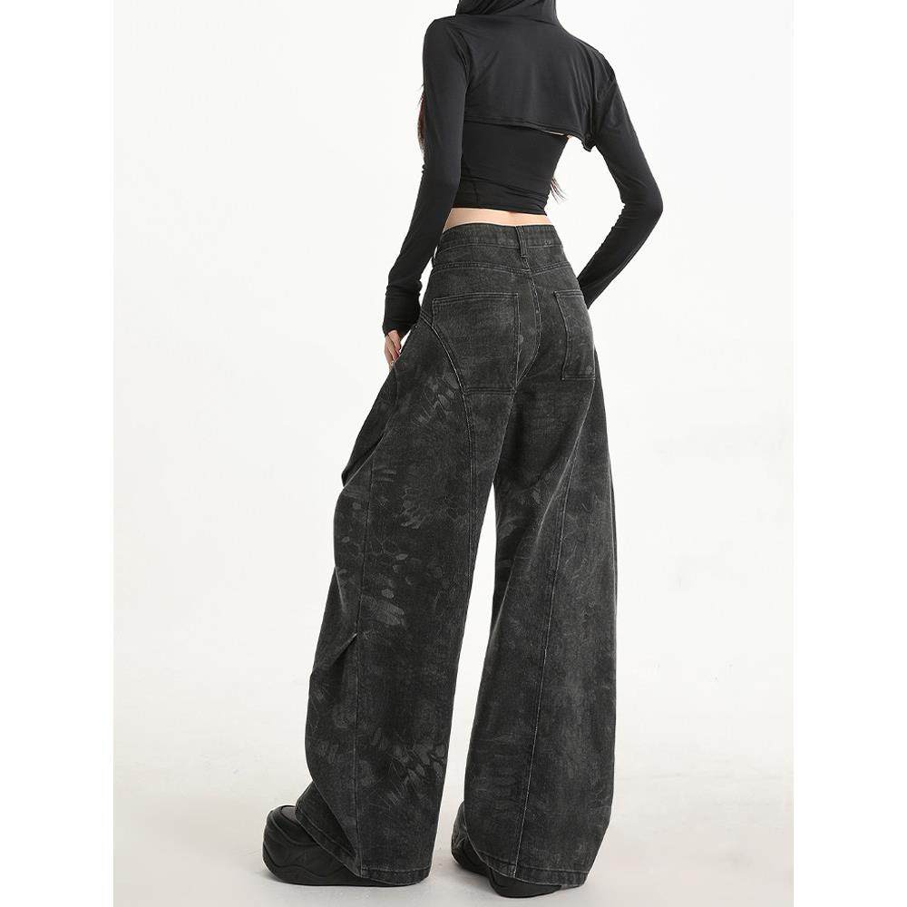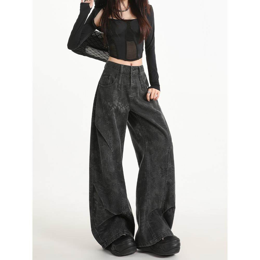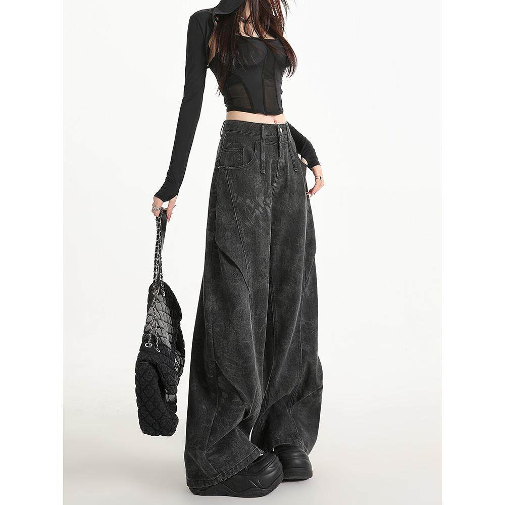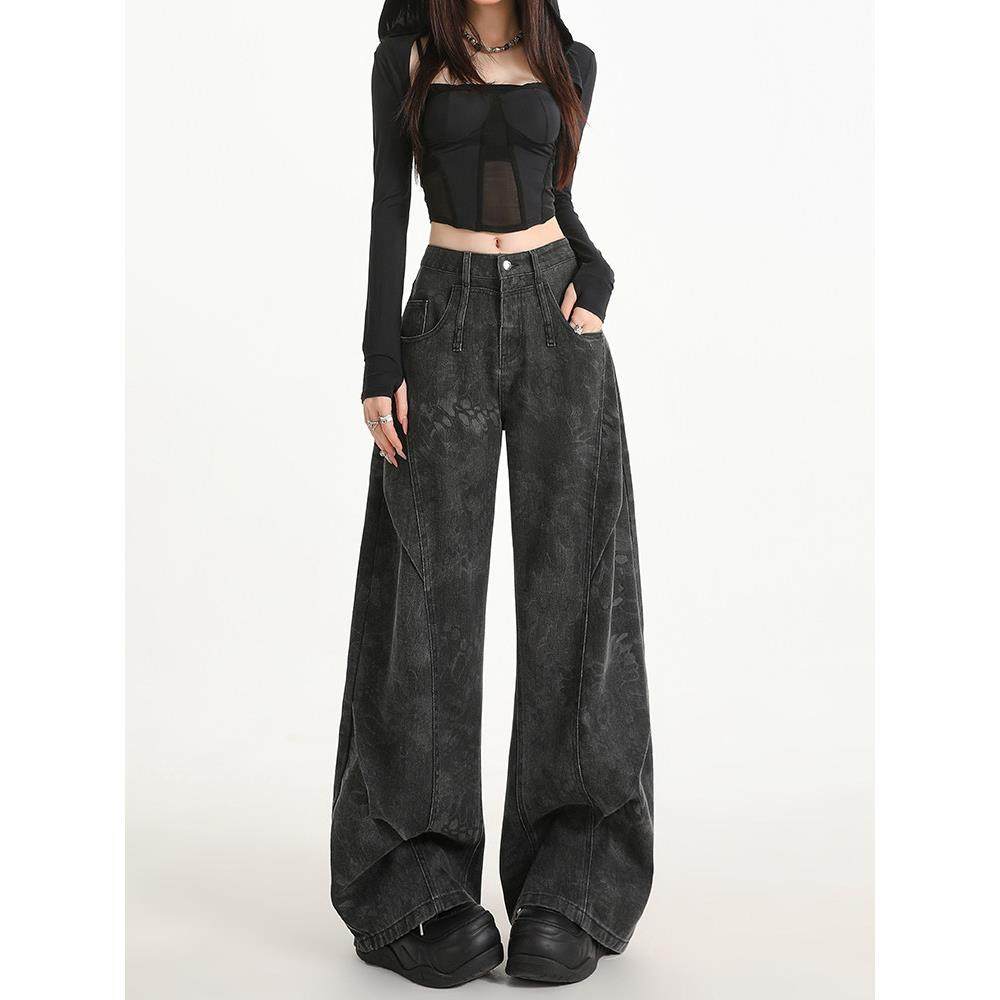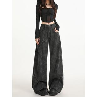 黑灰色印花阔腿牛仔裤 弯刀拖地裤 女秋季 小众设计感工装 子 新款 美式