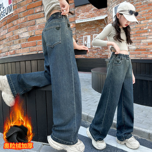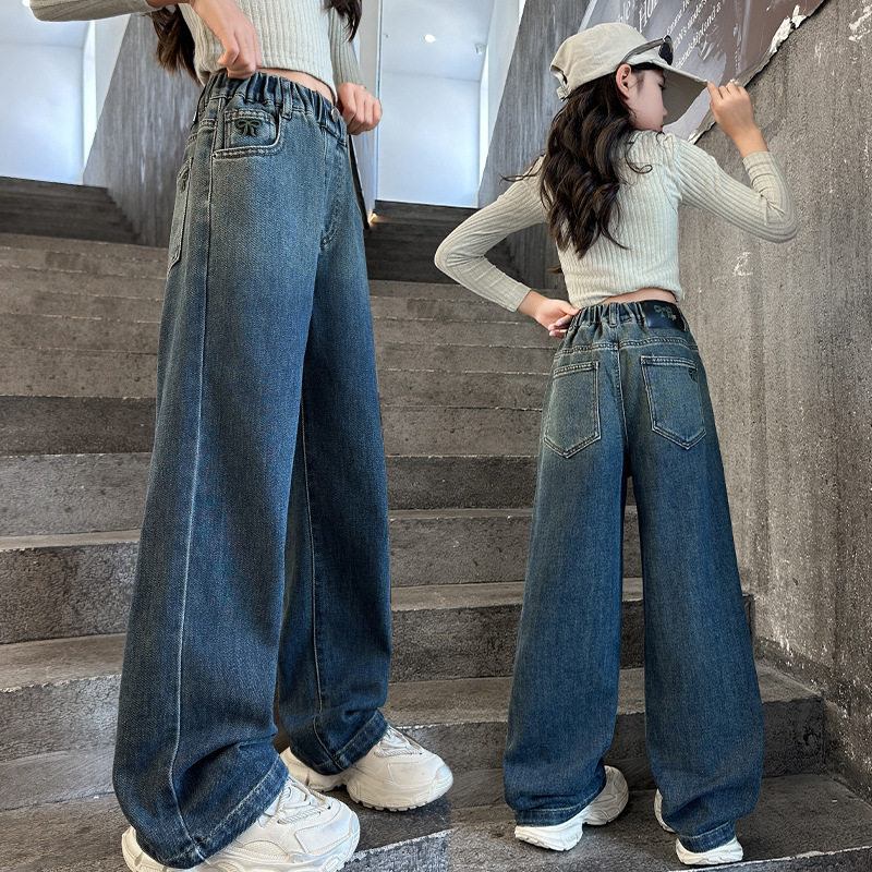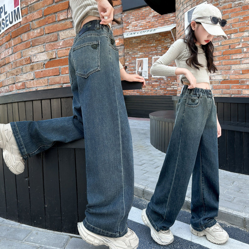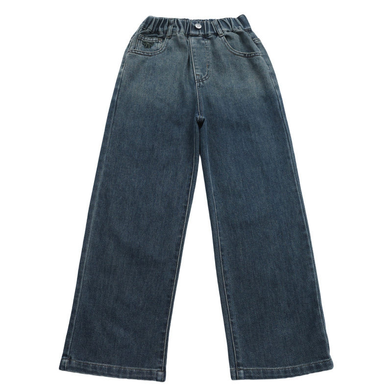 中大童宽松加绒绣花蝴蝶结阔腿裤 女童秋冬牛仔裤 韩版 冬季 2026新款