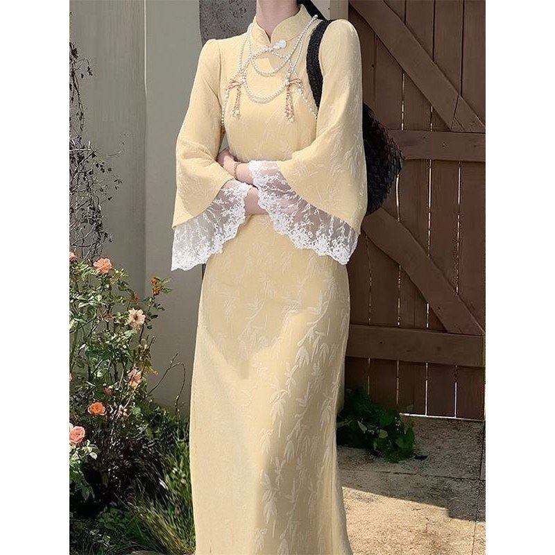 敬酒服新娘长袖 刺绣金竹子旗袍结婚连衣裙秋冬 加厚红色订婚新中式