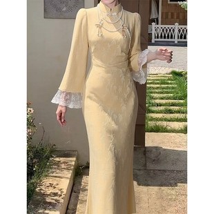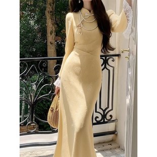 秋冬连衣裙旗袍开叉新中式 锦绒绣花 丝绒黑色长裙 潘泪滢 JKJS