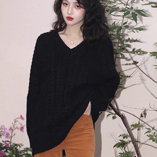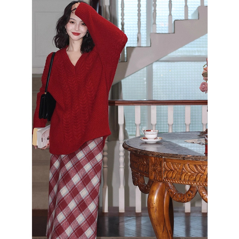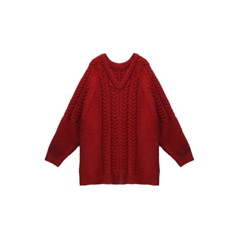 法国Rixo 女 kiel复古套头V领宽松红色麻花加厚外穿内搭毛衣针织衫