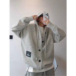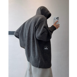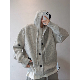 dannyandzee冬季 加厚重磅纯色连帽宽松百搭叠穿纽扣厚毛衣外套男