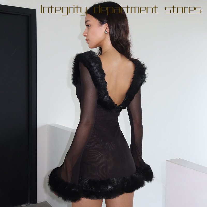 lace cut out top风秋冬毛领长袖 sexy sheer 一字领气质修 neck
