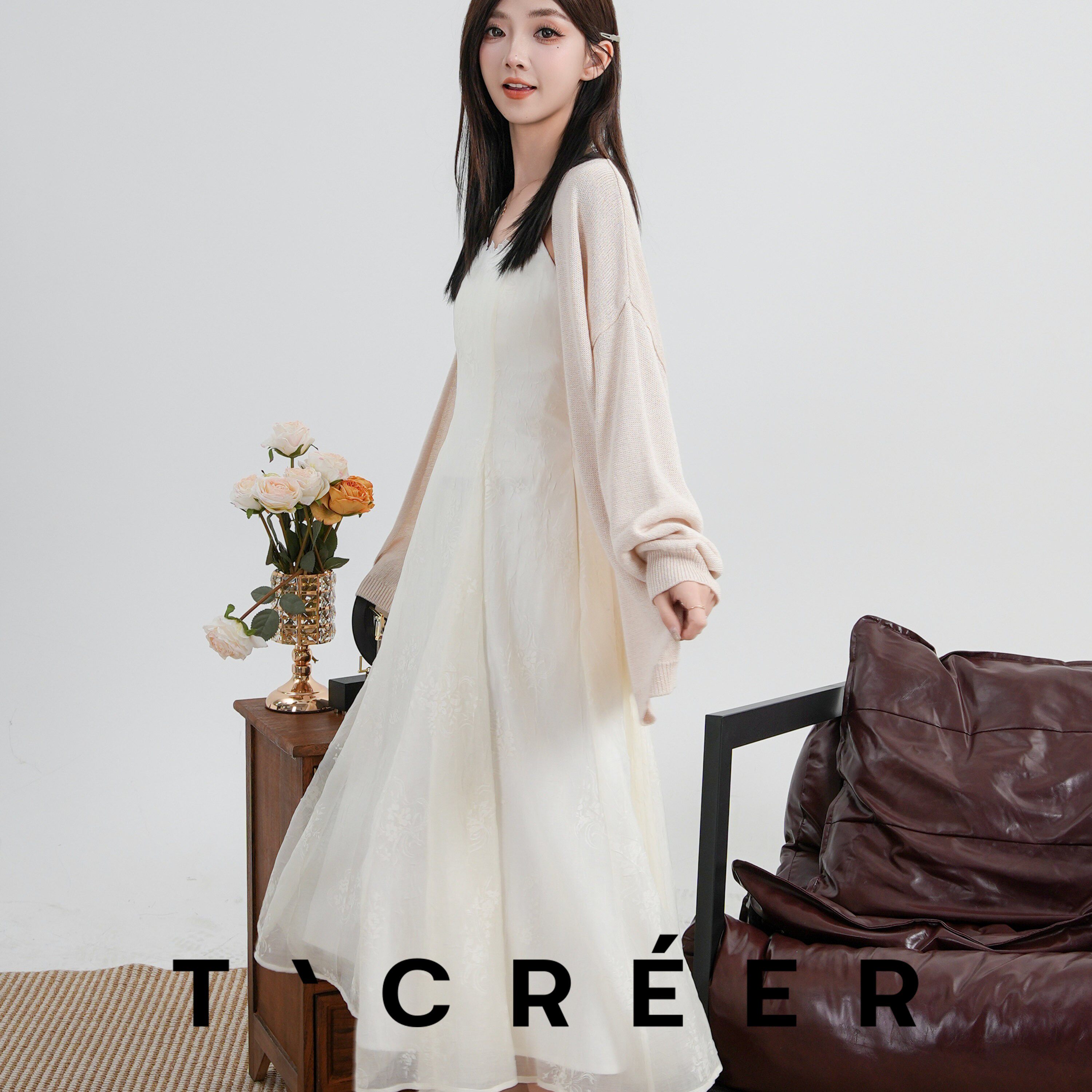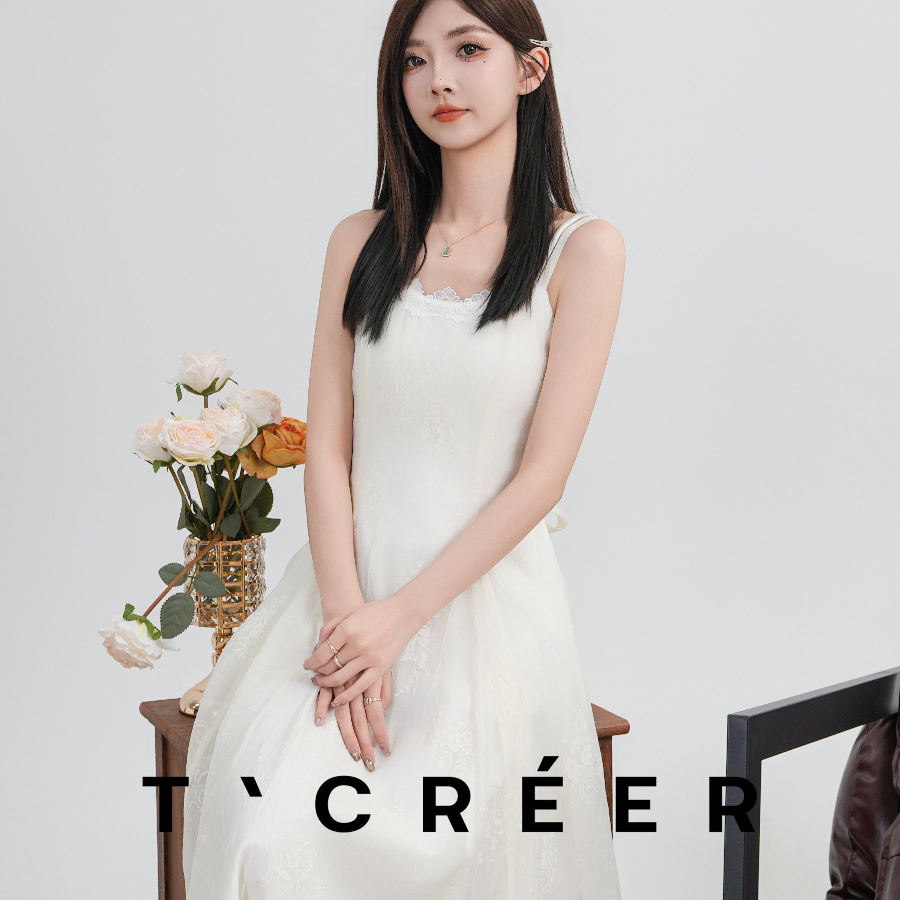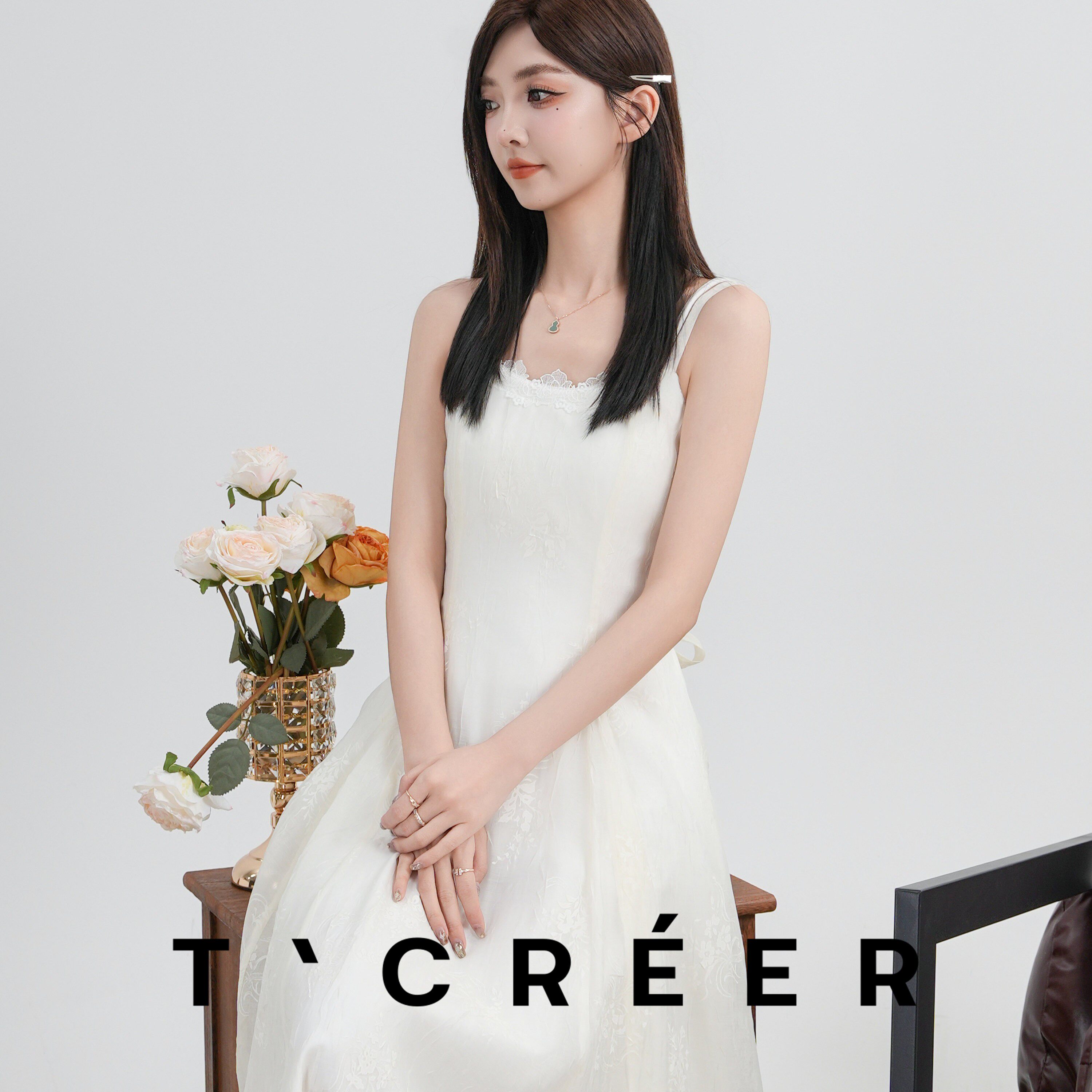 T`CREER| 白色蕾丝吊带裙肌理感温柔风连衣裙 清雅绝尘