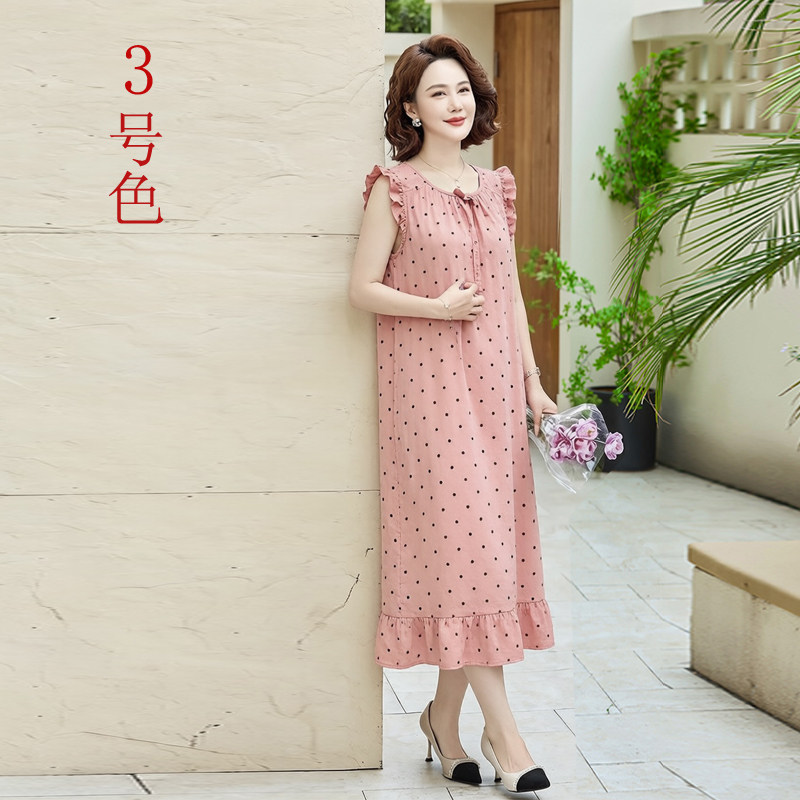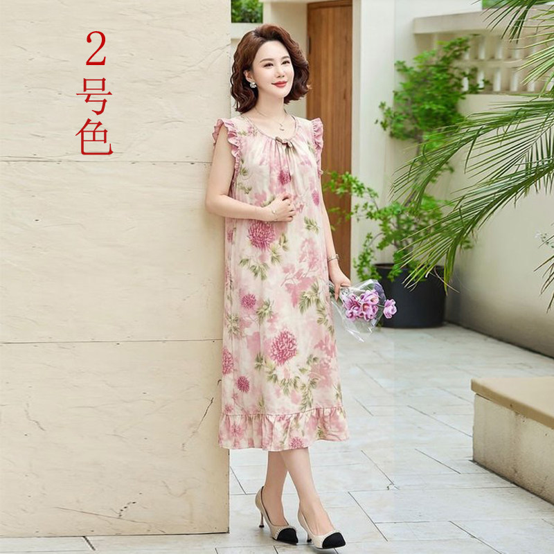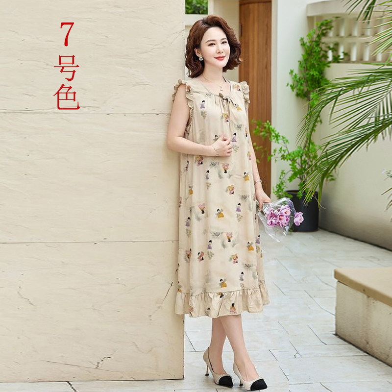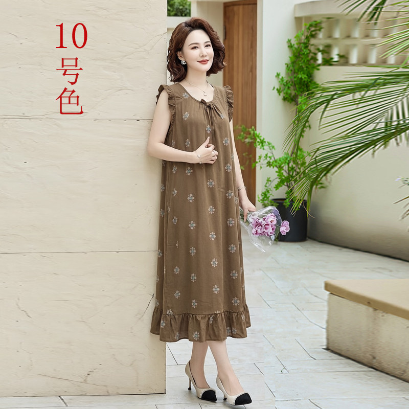 舒适中长款 碎花棉绸连衣裙宽松显瘦大码 妈妈外穿裙 无袖 中老年女装