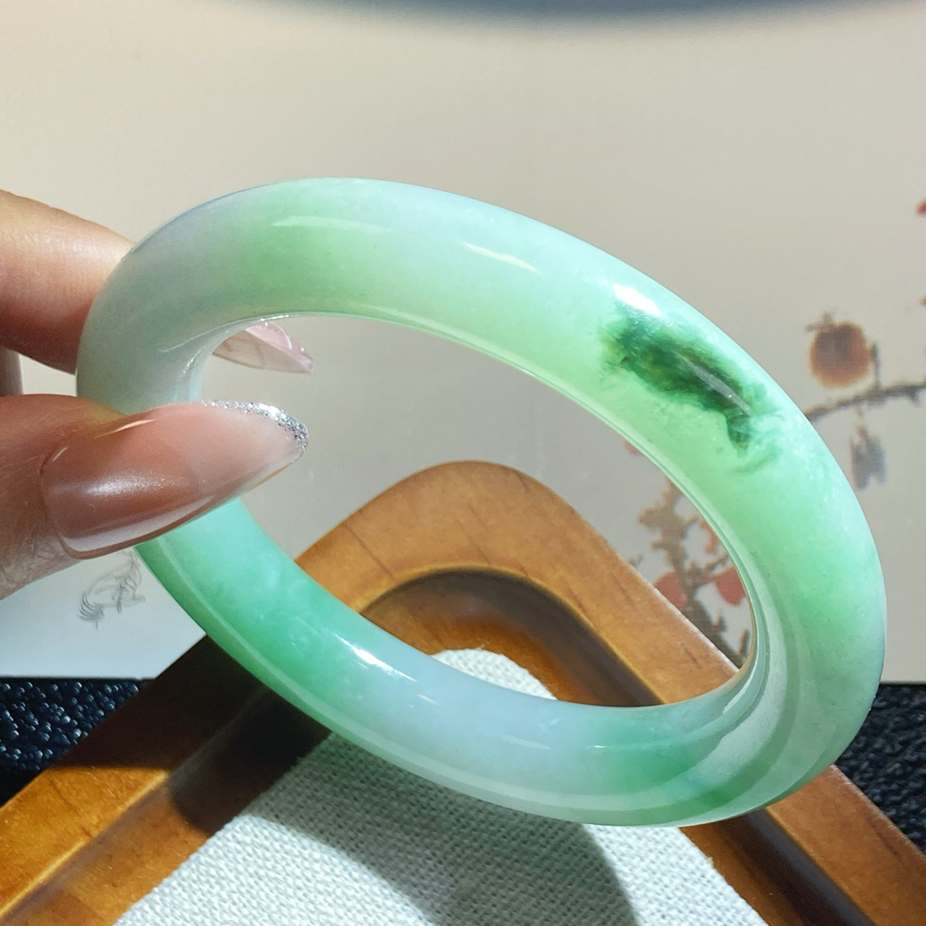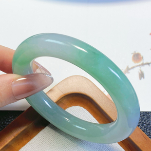0138号 天然缅甸翡翠a货细糯冰淡春彩胖圆条手镯 51圈口