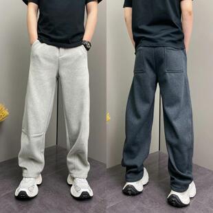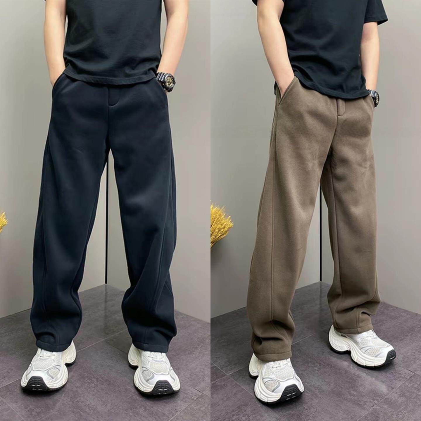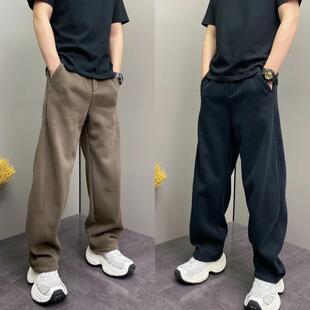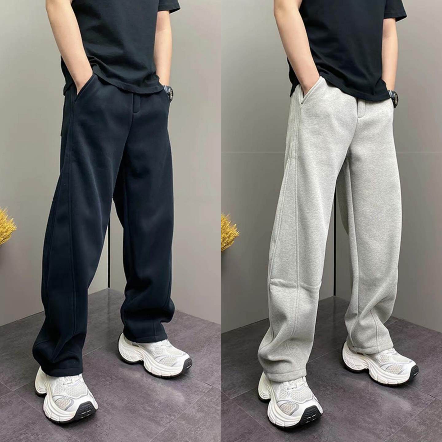 新款 冬季 加绒百搭宽松显瘦弯刀长 直筒休闲厚棉裤 简约明线拼接男士