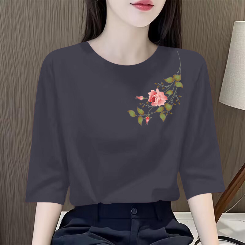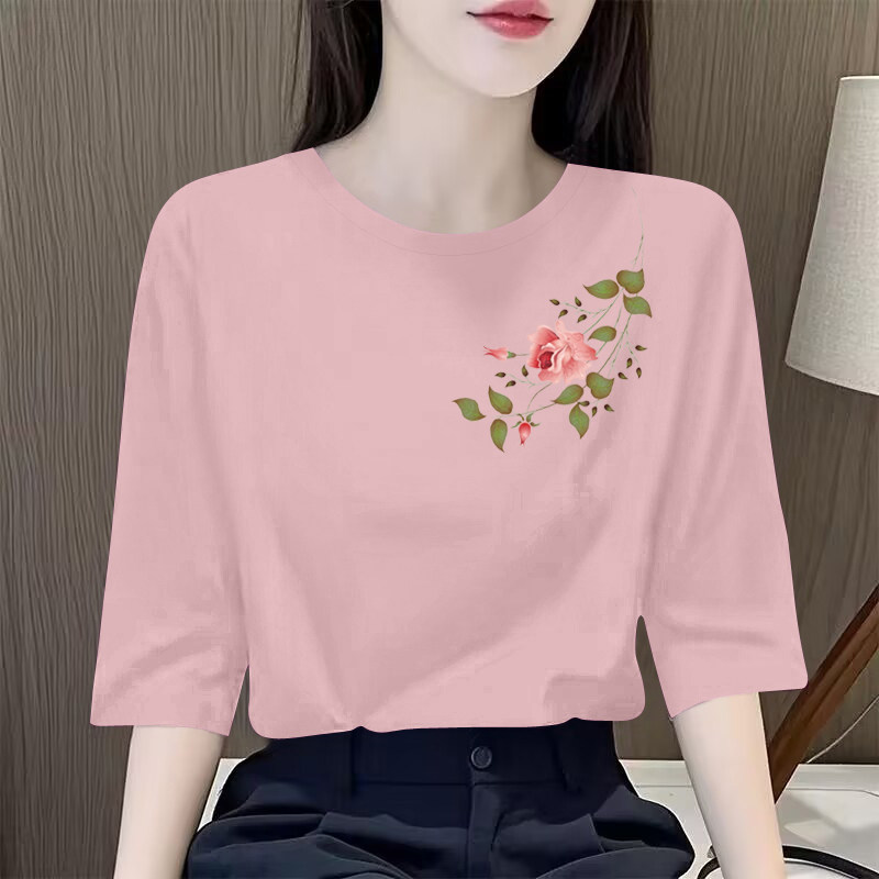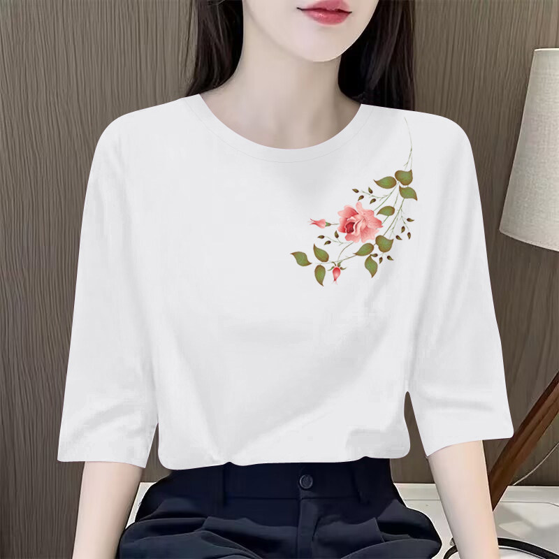 上衣气质印花文艺圆领T恤衫 外贸专柜高端女装 休闲复古纯棉七分袖