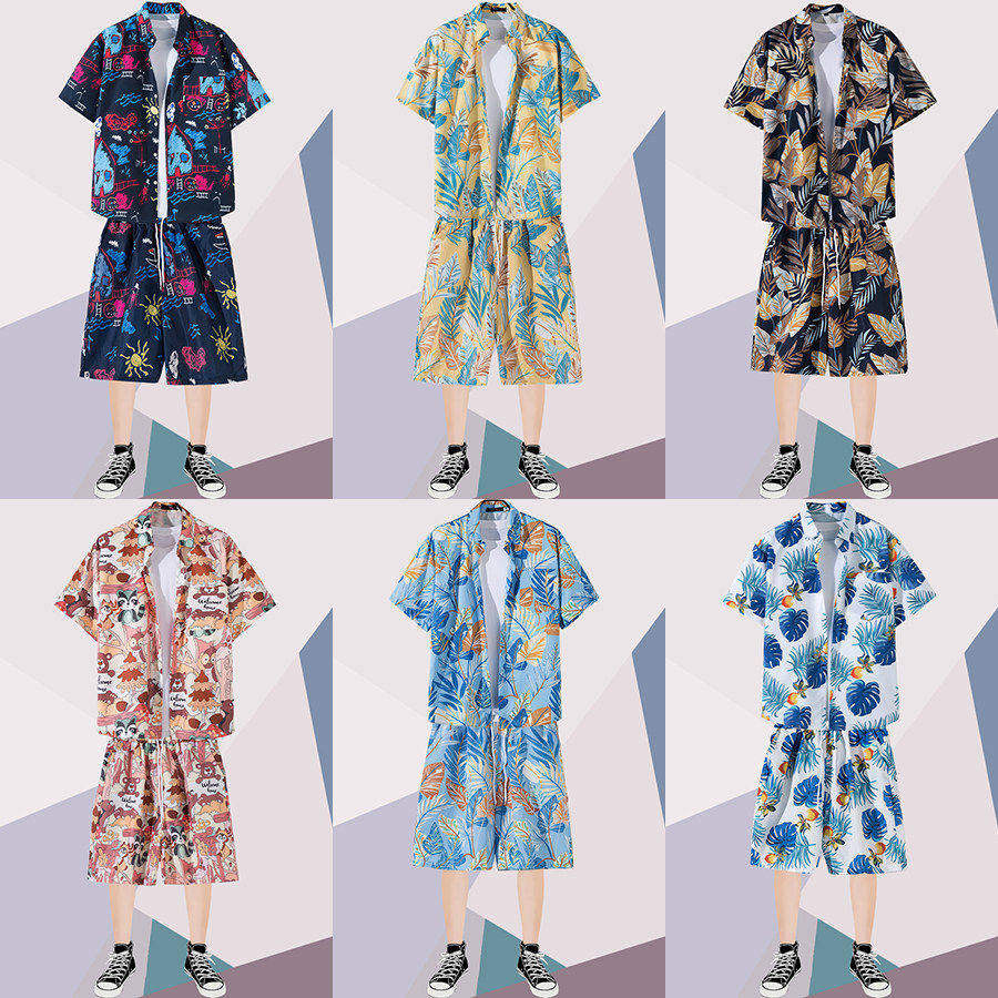 衬衫 短袖 男士 宽松休闲短裤 男 潮牌夏季 情侣花衬衣两件沙滩套装 薄款