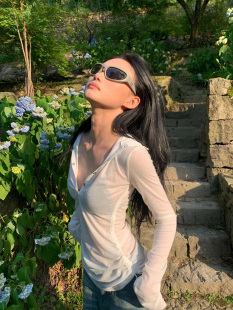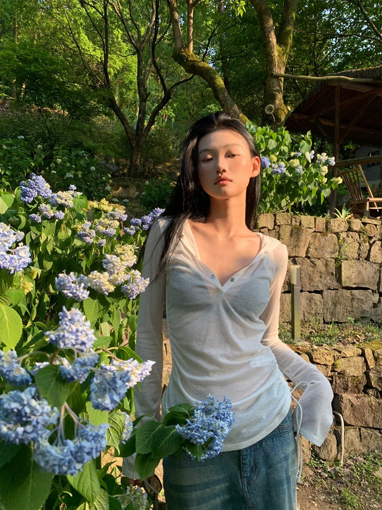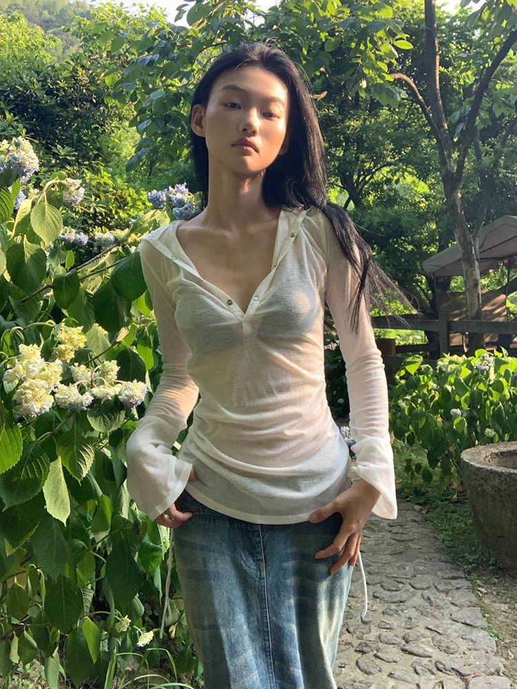修身 辣妹v领连帽防晒衣女款 罩衫 薄纱长袖 微透t恤褶皱抽绳上衣 夏季