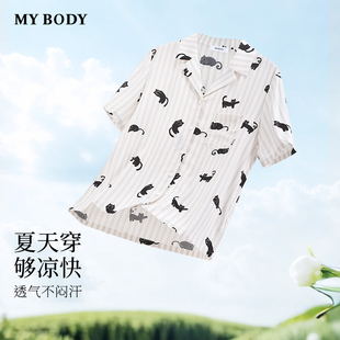 短裤 可爱猫咪印花条纹短袖 可外穿家居服 睡衣女套装 MYBODY商场同款