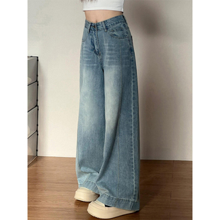 胖妹妹mm梨型身材高腰宽松显瘦直筒裤 复古蓝阔腿牛仔裤 女秋冬新款