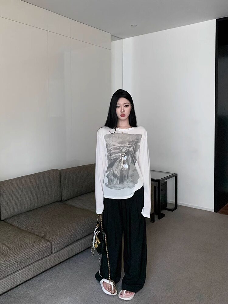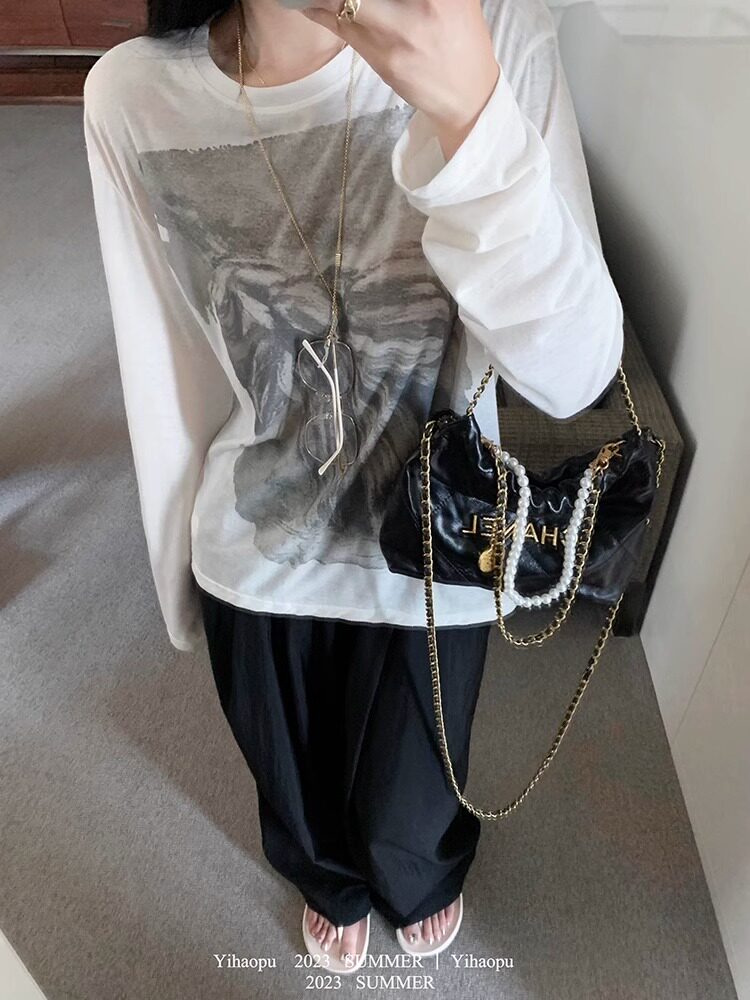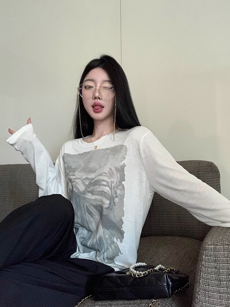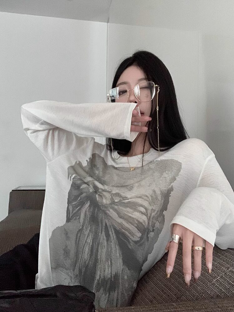 设计感印花圆领宽松防晒罩衫 薄款 上衣潮 面膜T恤女夏季 慵懒风长袖