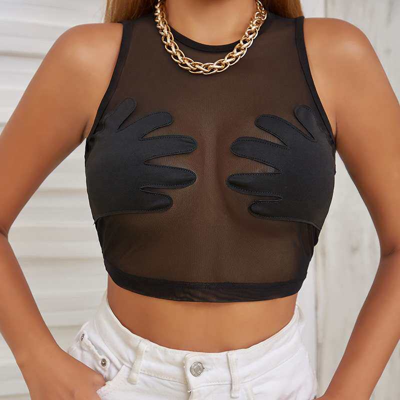 透视网纱拼接手掌创意小背心女women 圆领无袖 clothes 女装 2024款