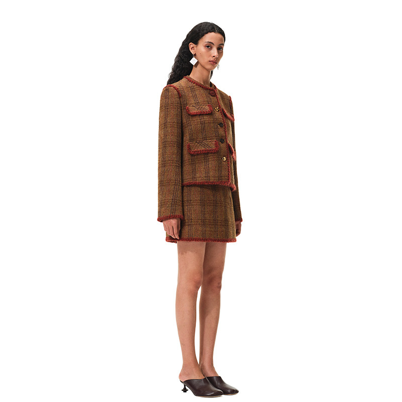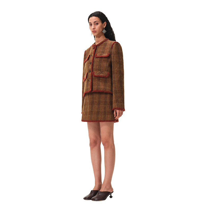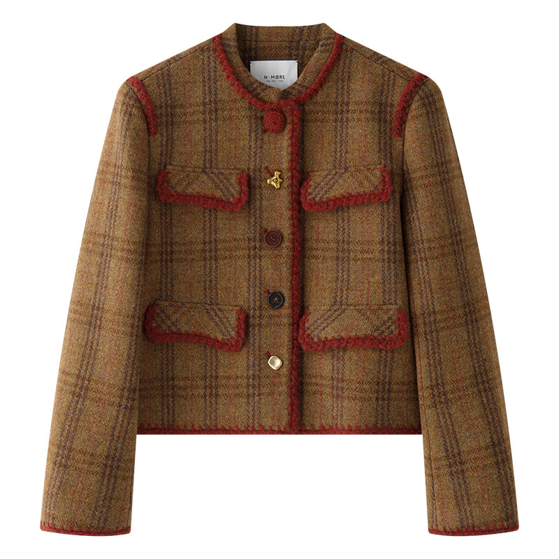 N·MORE设计师品牌 饰线箱型外套 果壳棕复古格纹手工装