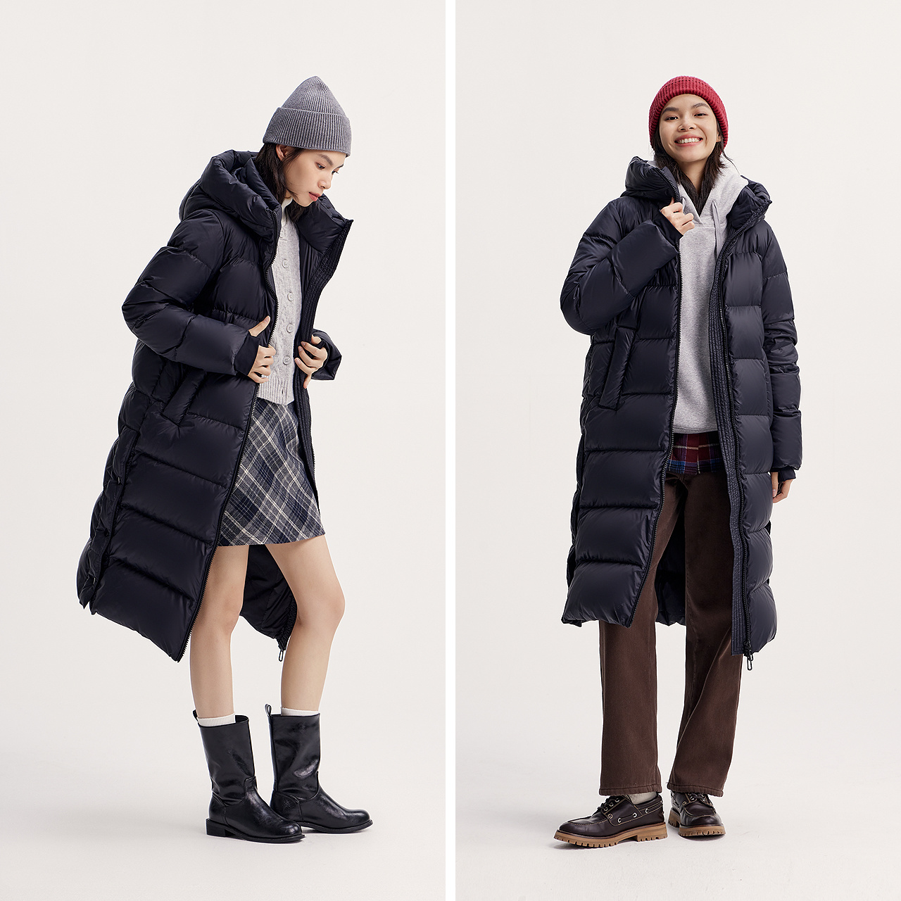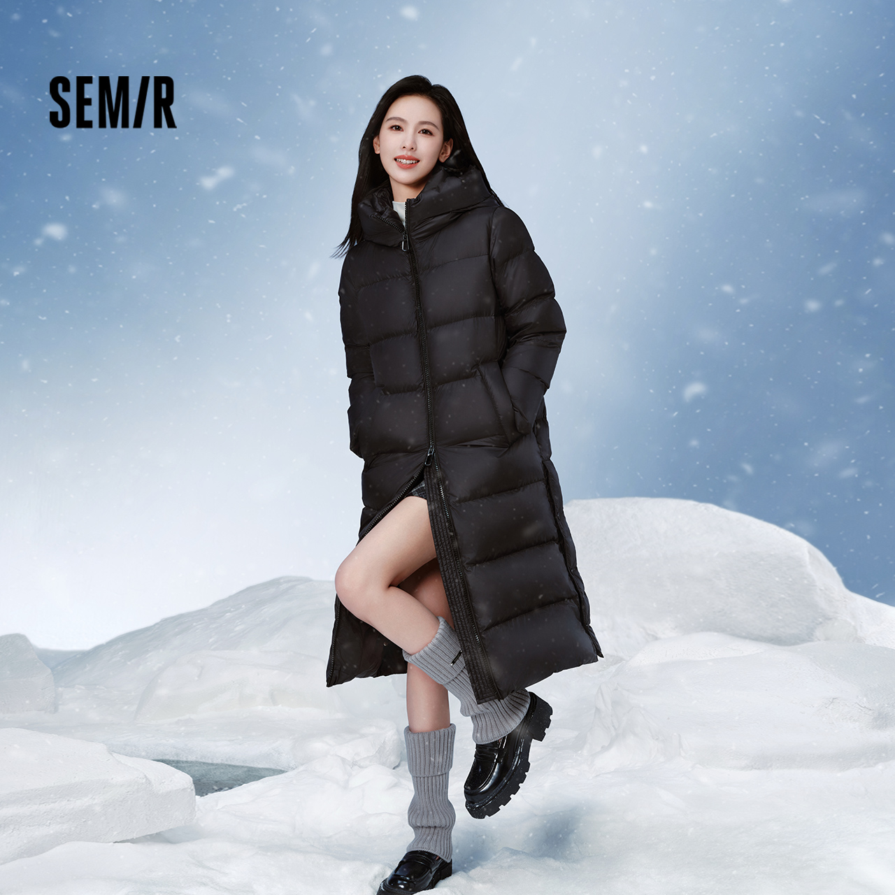森马羽绒服女冬长款 开叉90绒子黑色防泼水连帽保暖休闲百搭鹅绒服