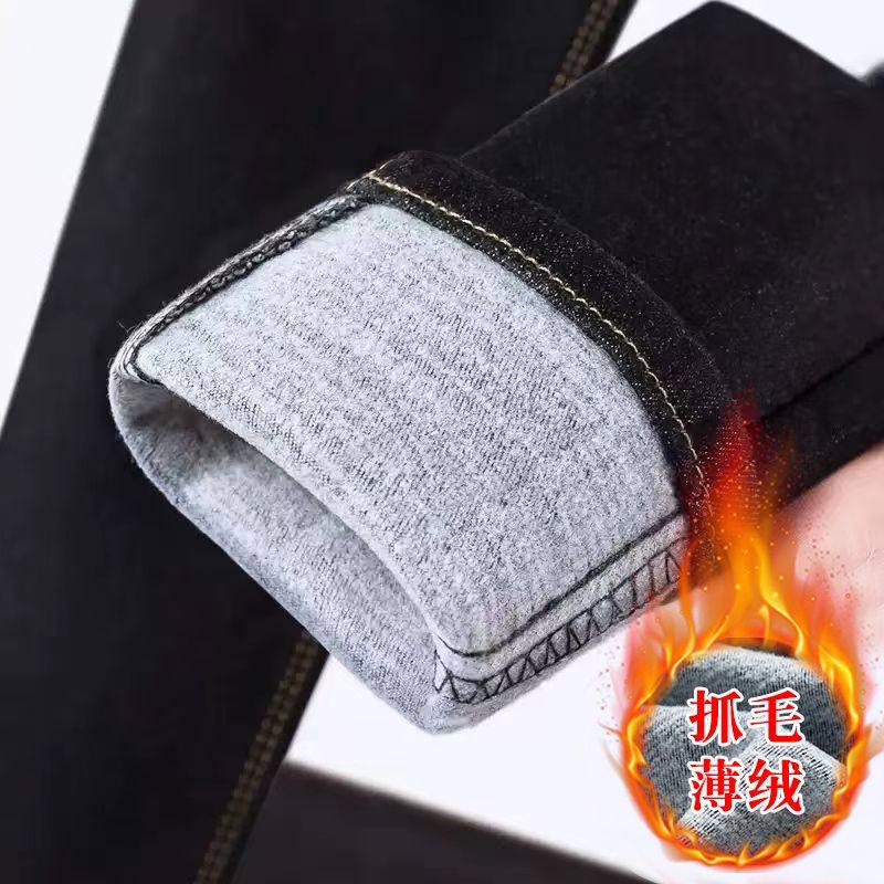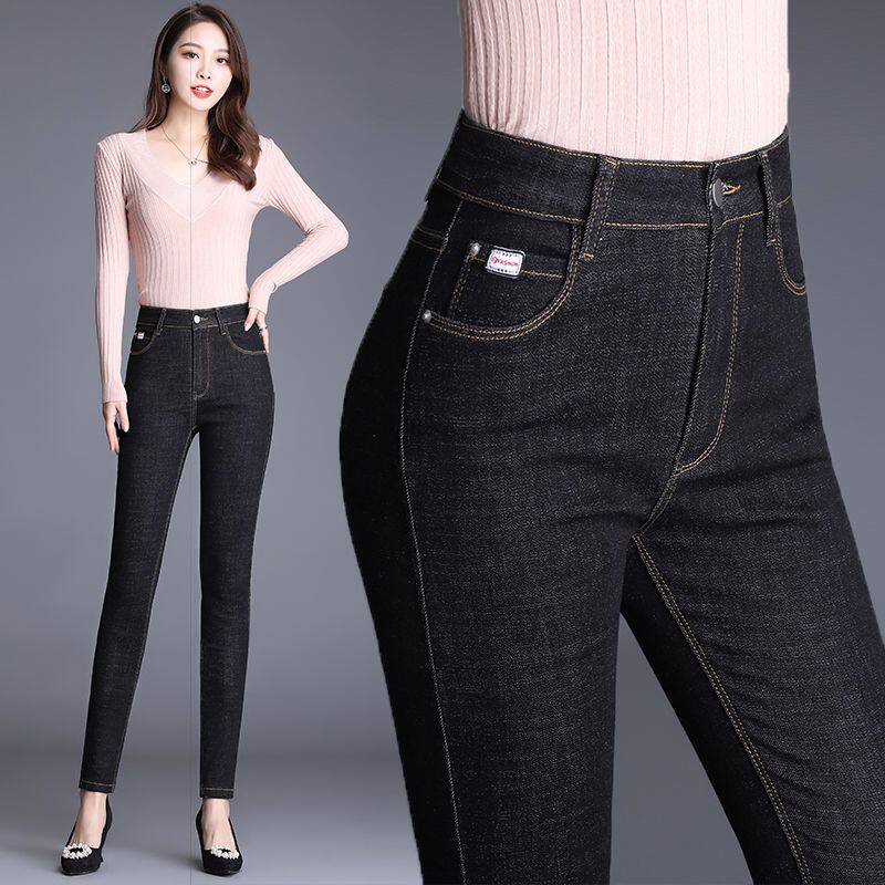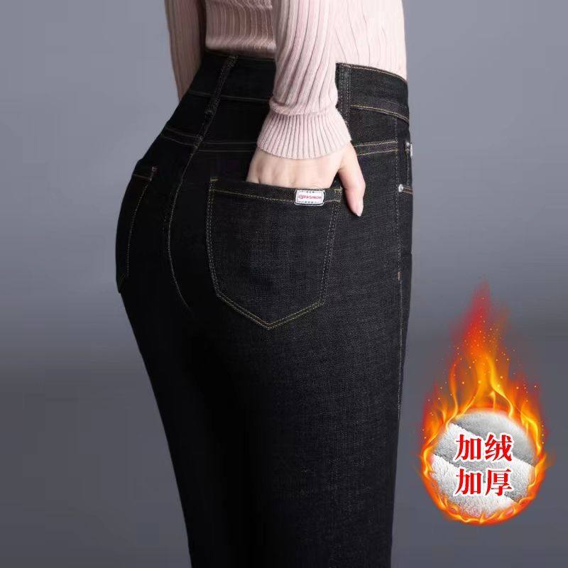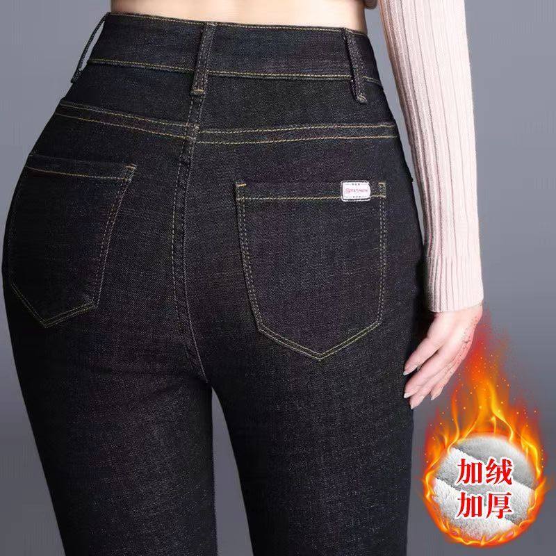 紧身小脚长裤 薄绒加绒加厚高腰显瘦弹力修身 女九分秋季 黑色牛仔裤