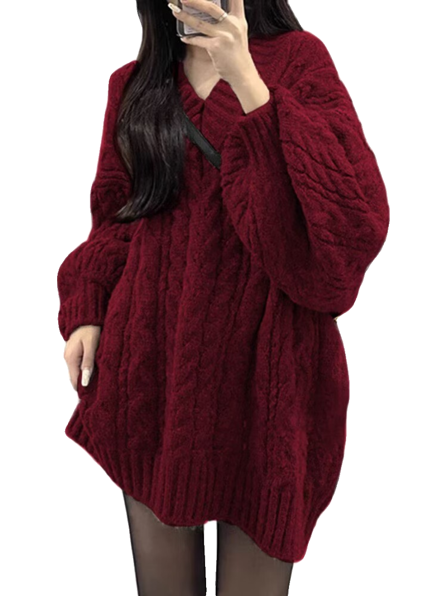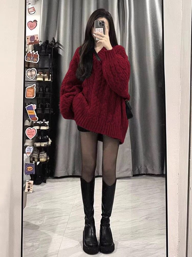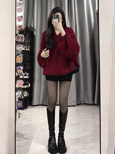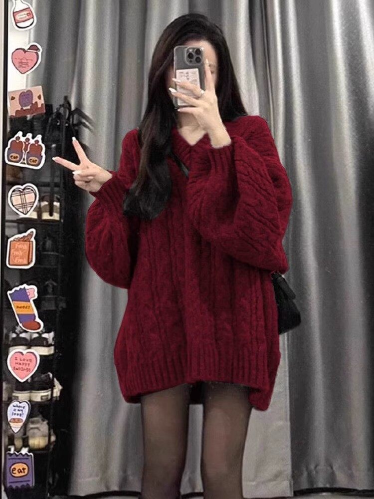 潮 宽松针织衫 加厚版 洋气红色慵懒风V领麻花套头毛衣女秋冬新款