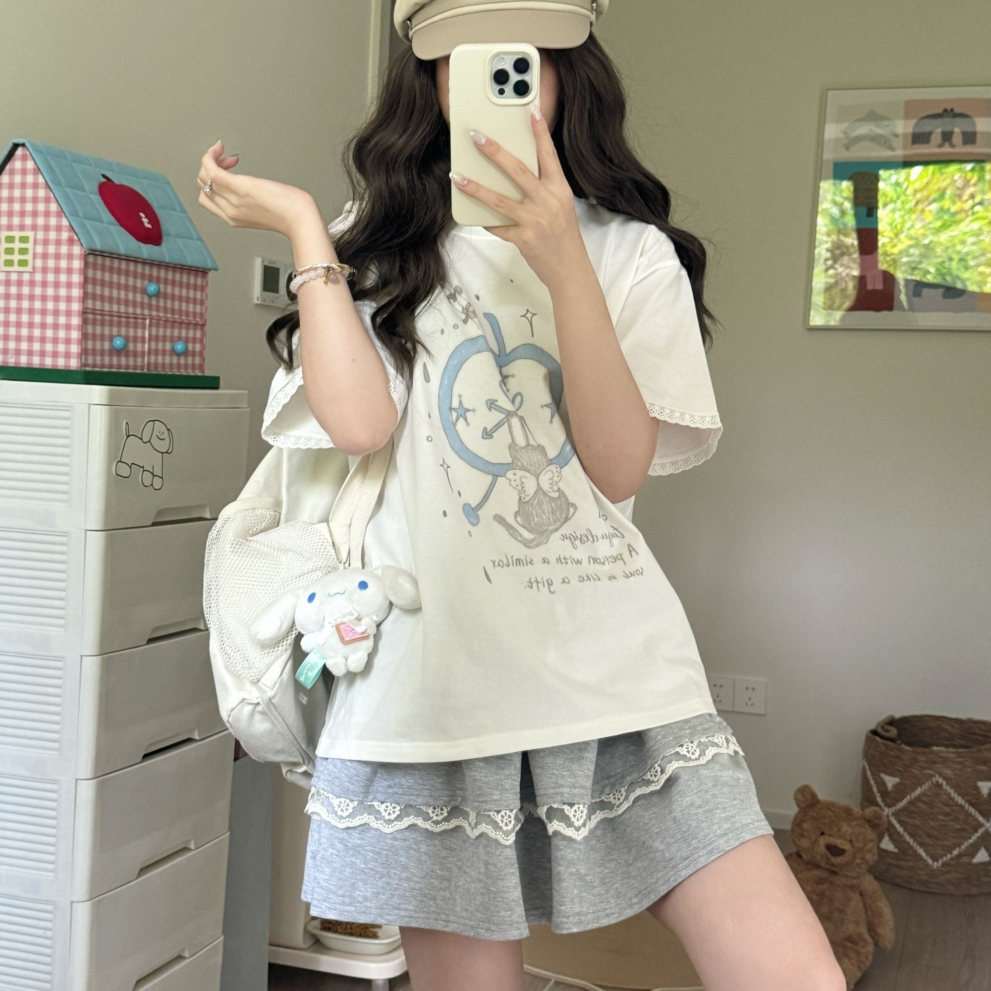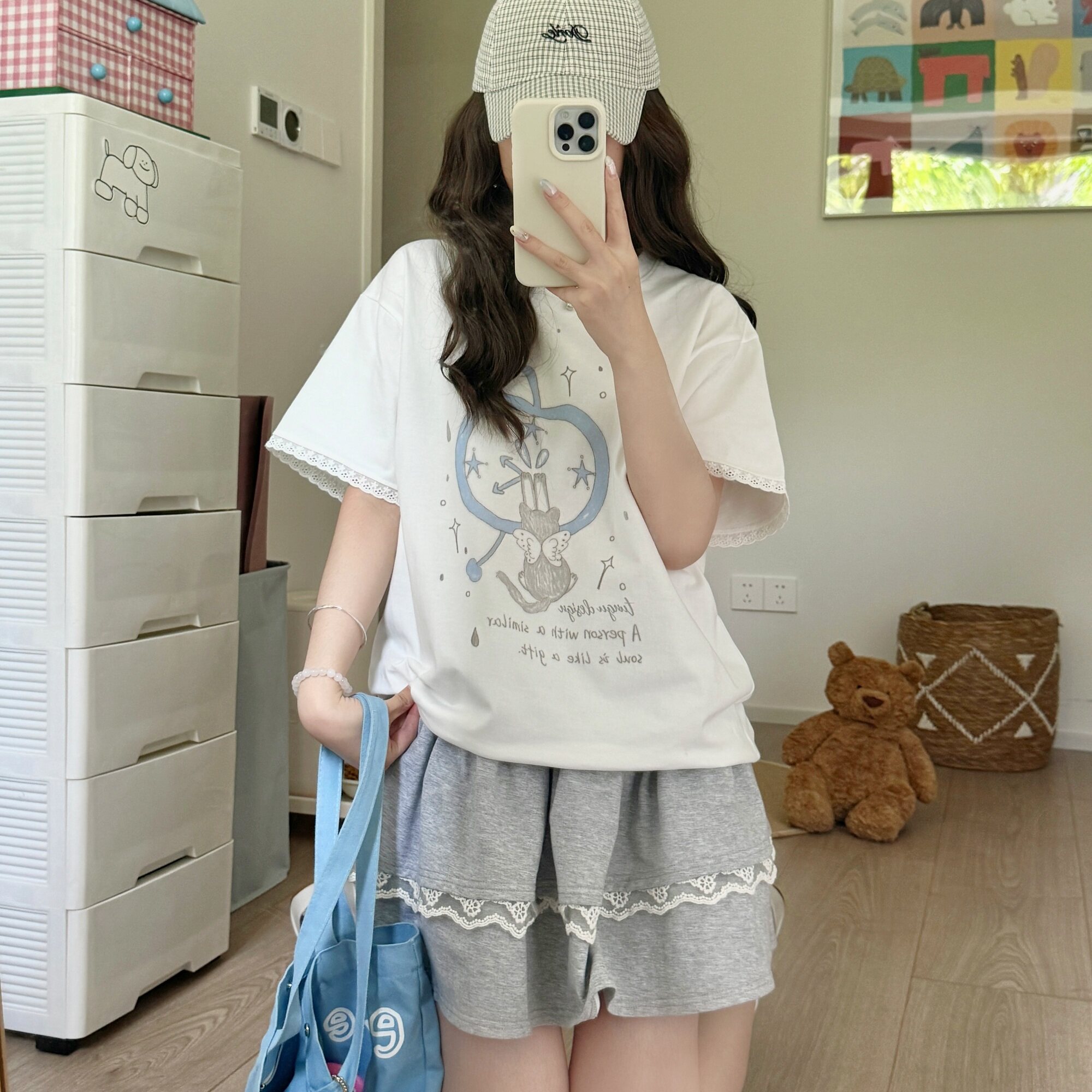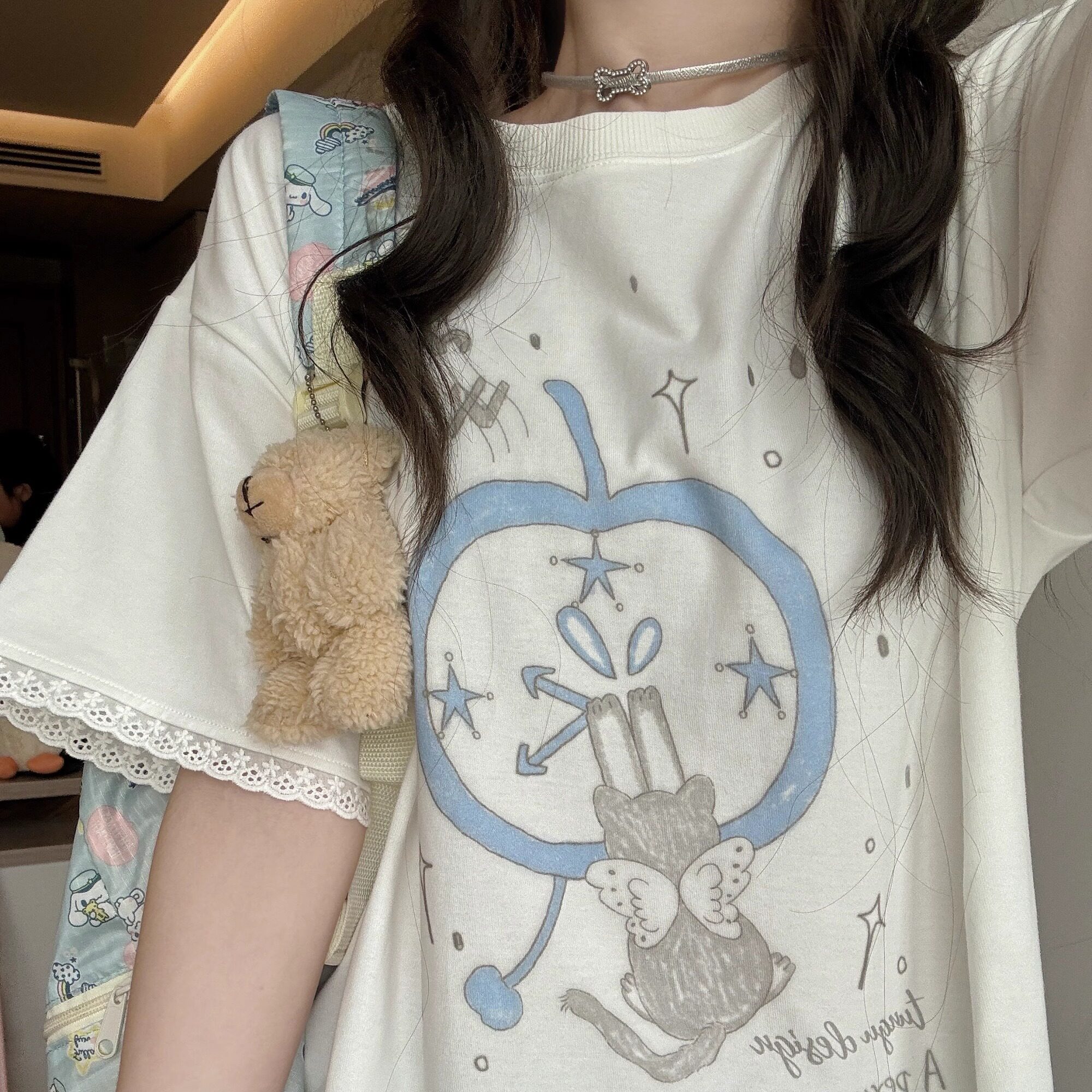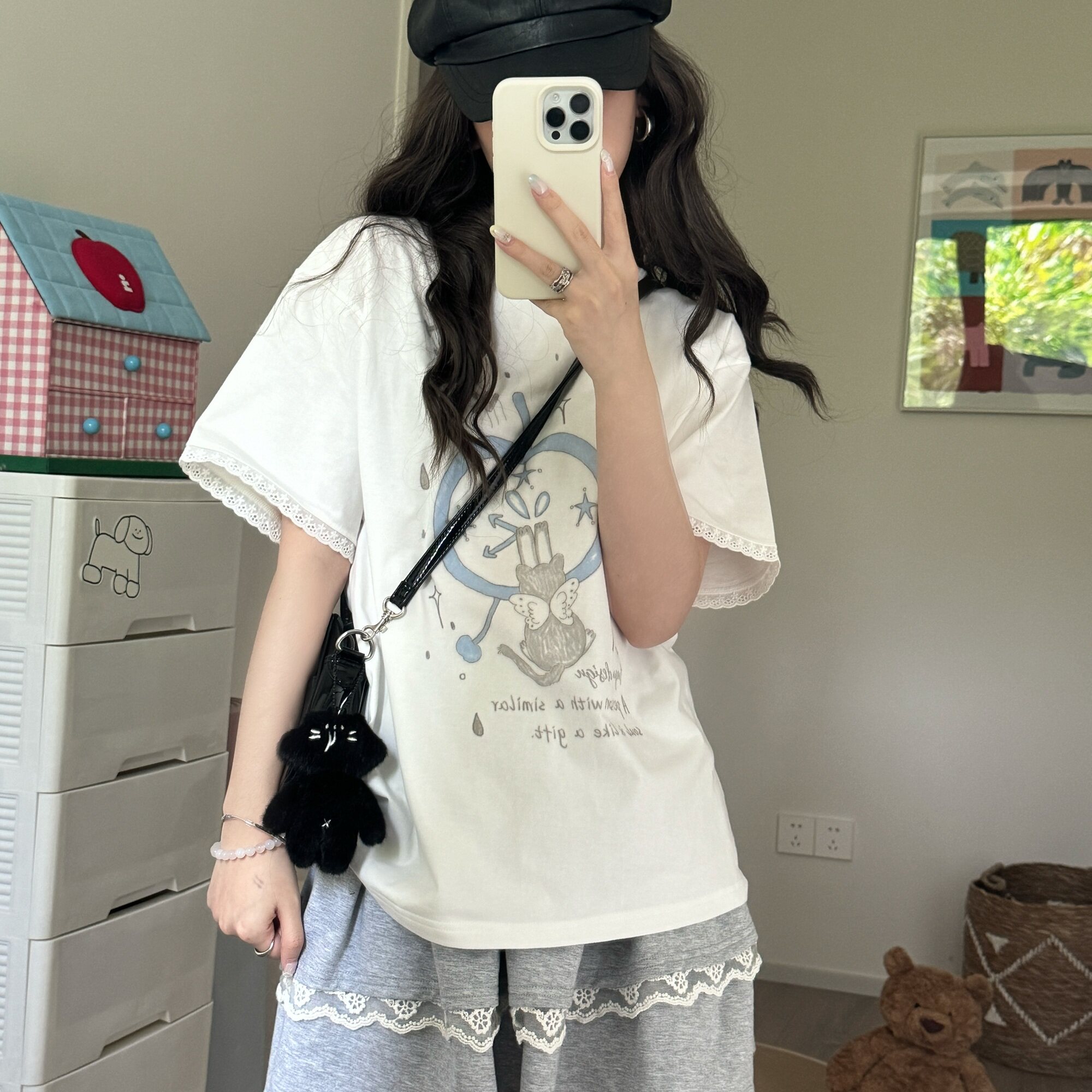 女 原创可爱印花T恤花边百搭纯棉春夏白短袖 星月豚骨 音符小猫