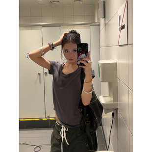 夏显瘦百搭修身 F383 短袖 复古U型领印花设计基础款 上衣女ins 美式