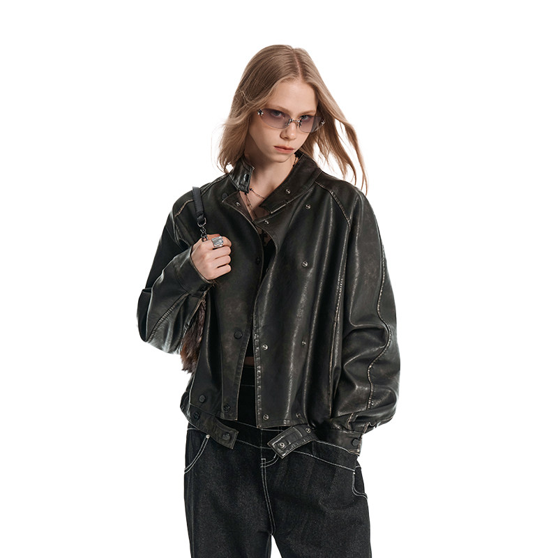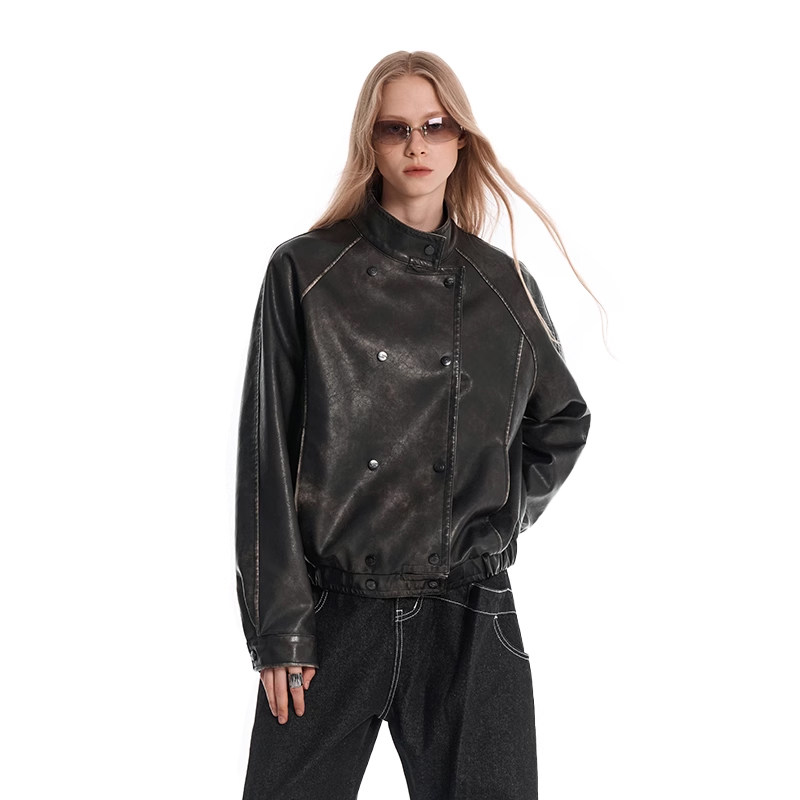 IMXS机车服PU皮双排扣皮夹克金属擦脏工装 皮衣外套男2025年新款