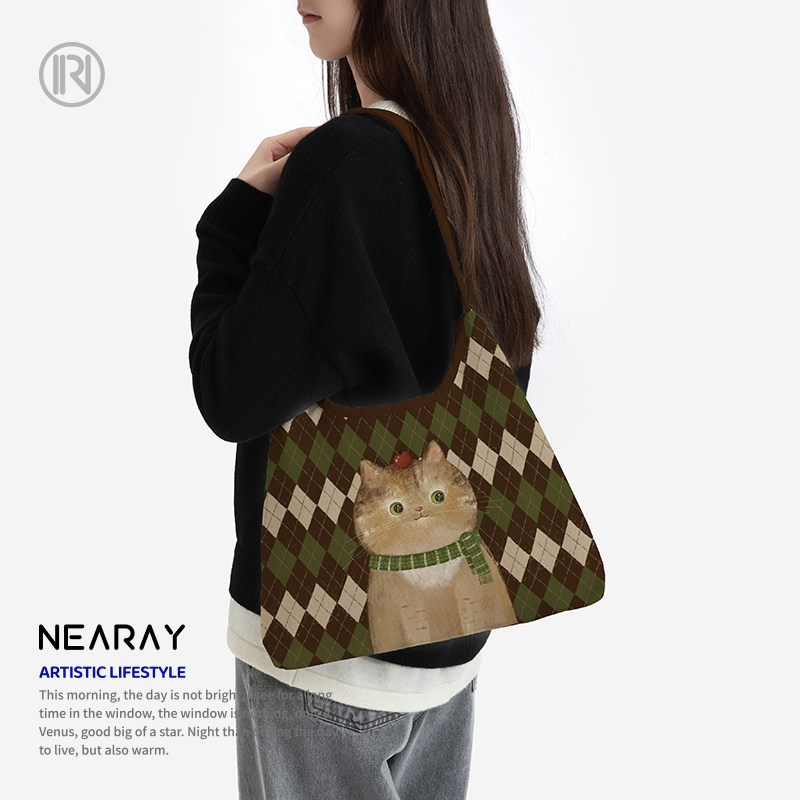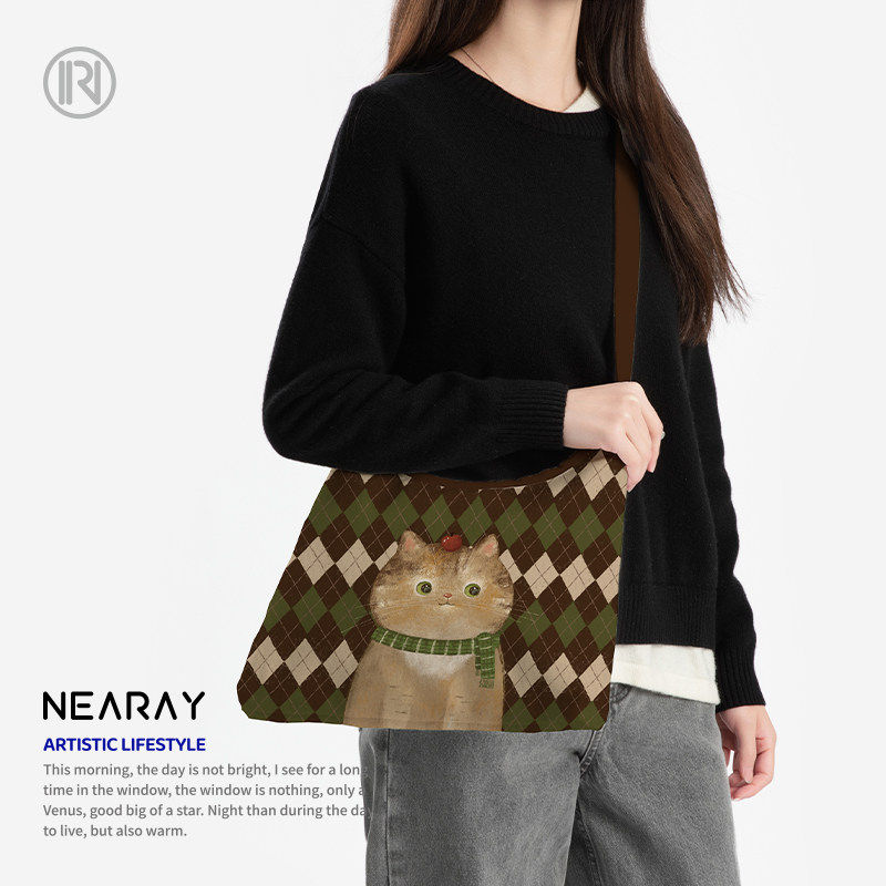 尼睿新款 原创大容量复古格纹帆布包可爱猫咪日常休闲通勤斜挎包AI