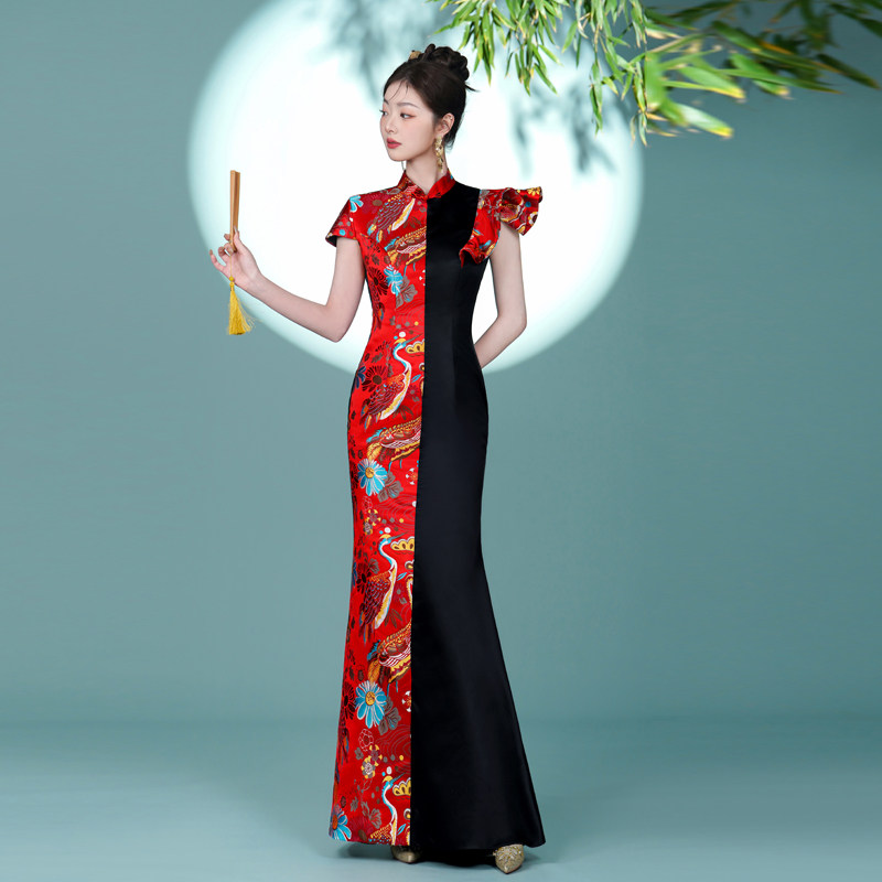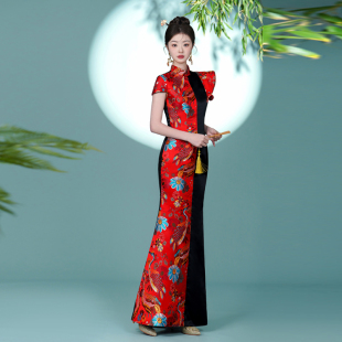 红色新中式 24款 印花裙高档旗袍长款 金丝绒压花妈妈新中式 复古 冬季