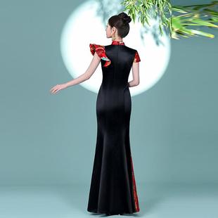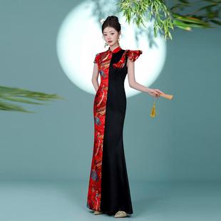 新款 改良年会迎宾 2023走秀表演阳光绒格子长旗袍女中国风复古修身