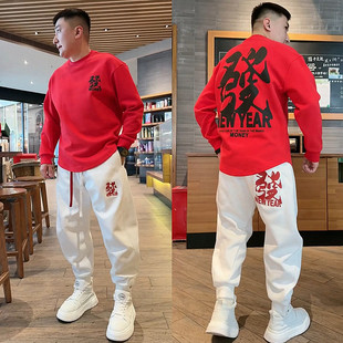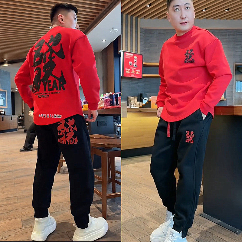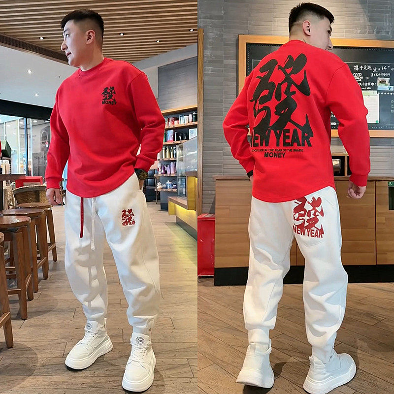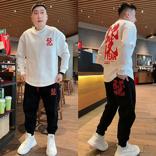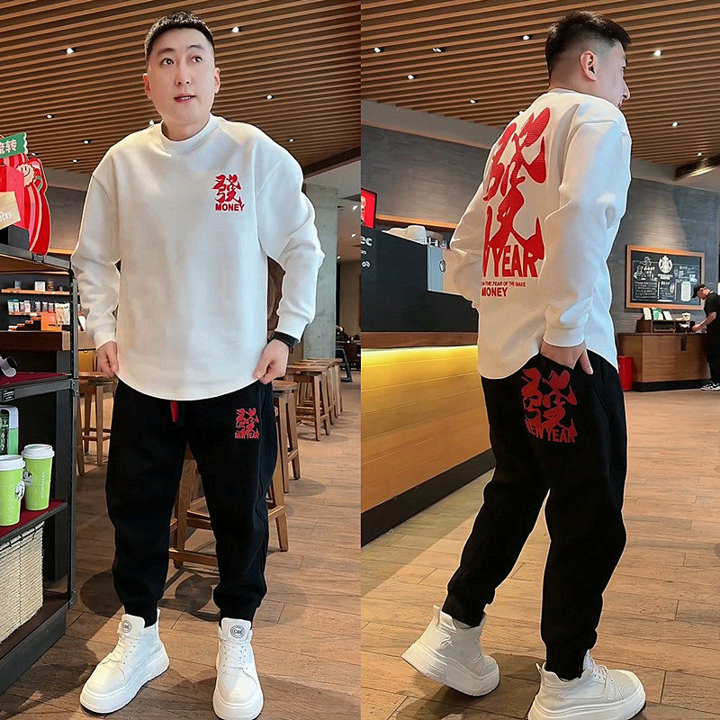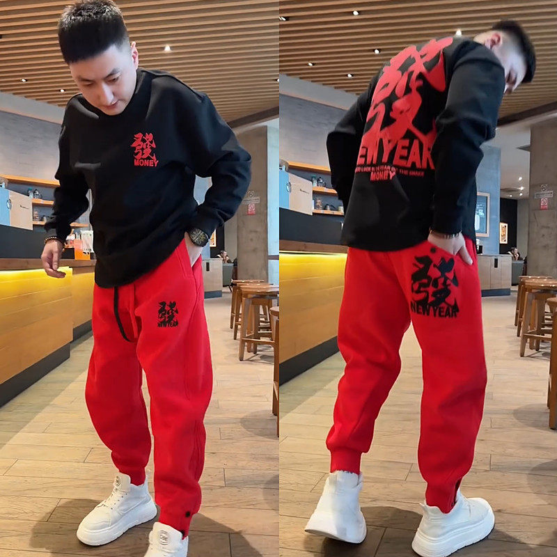 男宽松百搭燕尾卫衣束脚卫裤 秋冬新年款 發财刺绣加绒潮牌休闲套装