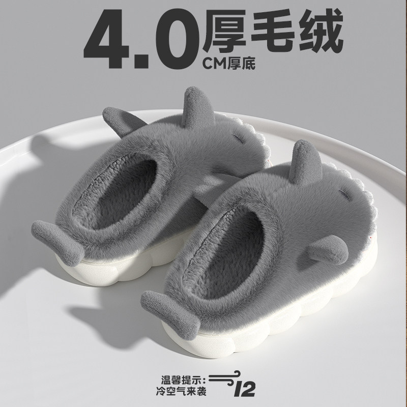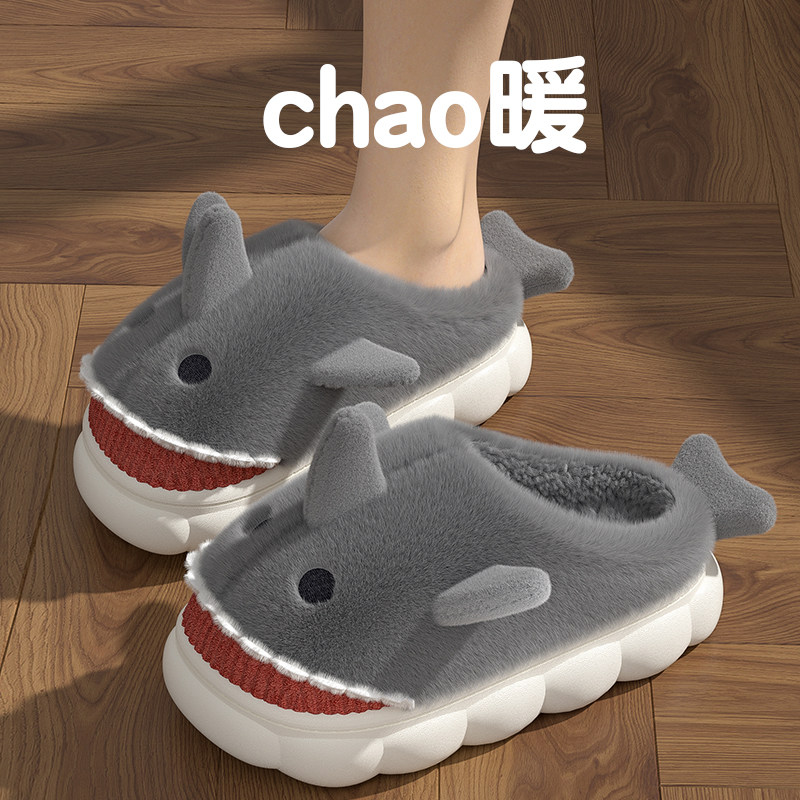 新款 冬季 情侣外穿厚底保暖室内居家防滑棉拖女冬天 男士 鲨鱼棉拖鞋