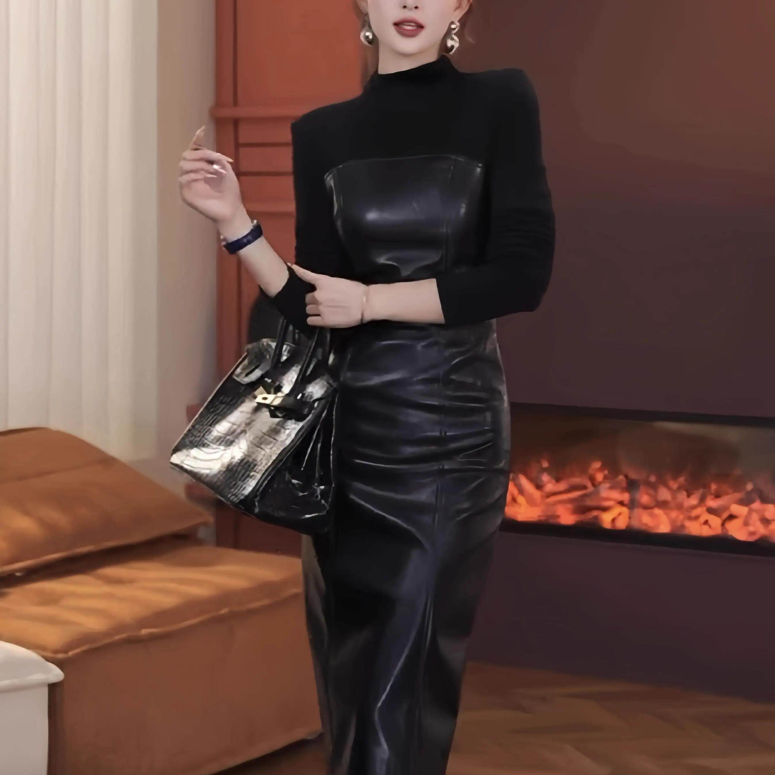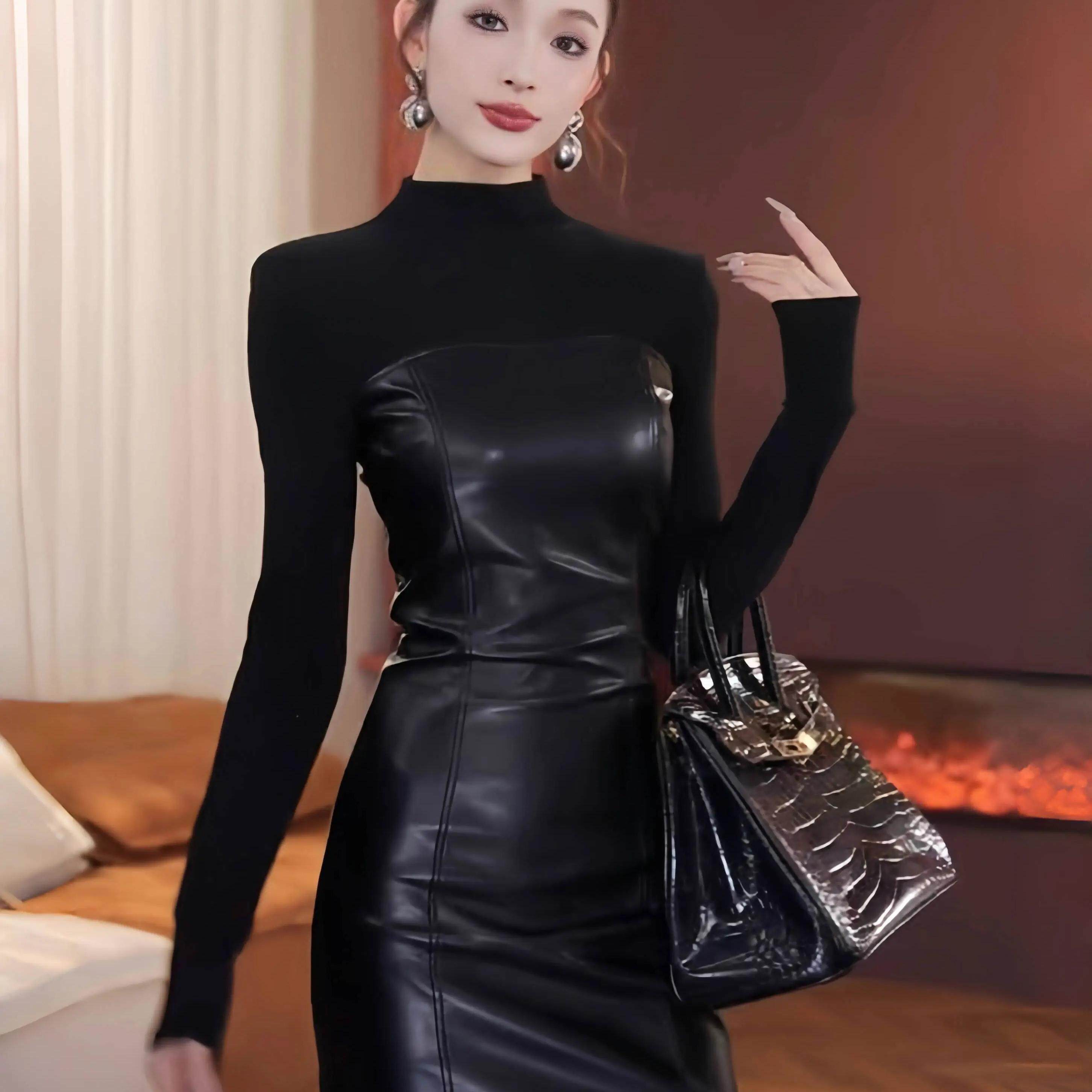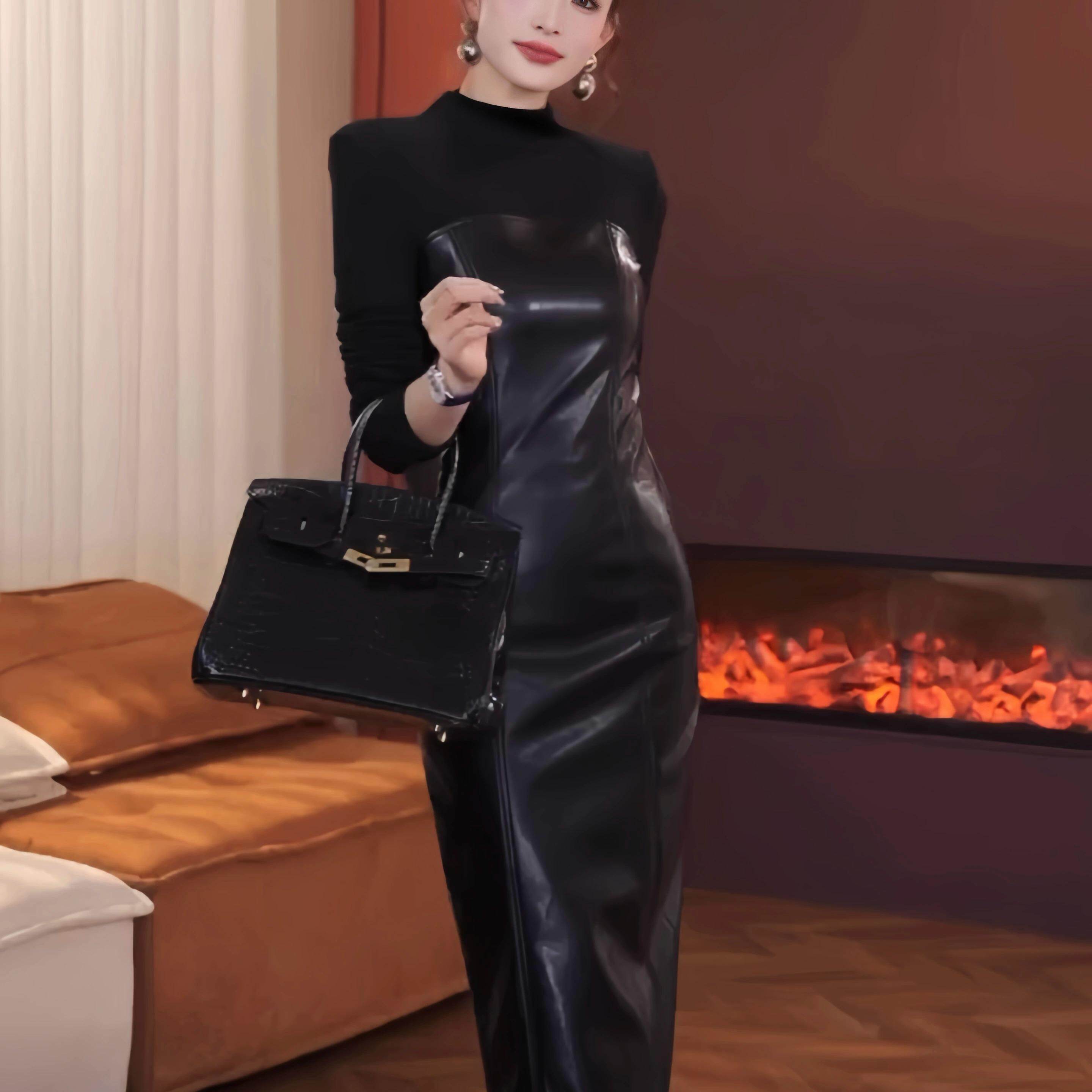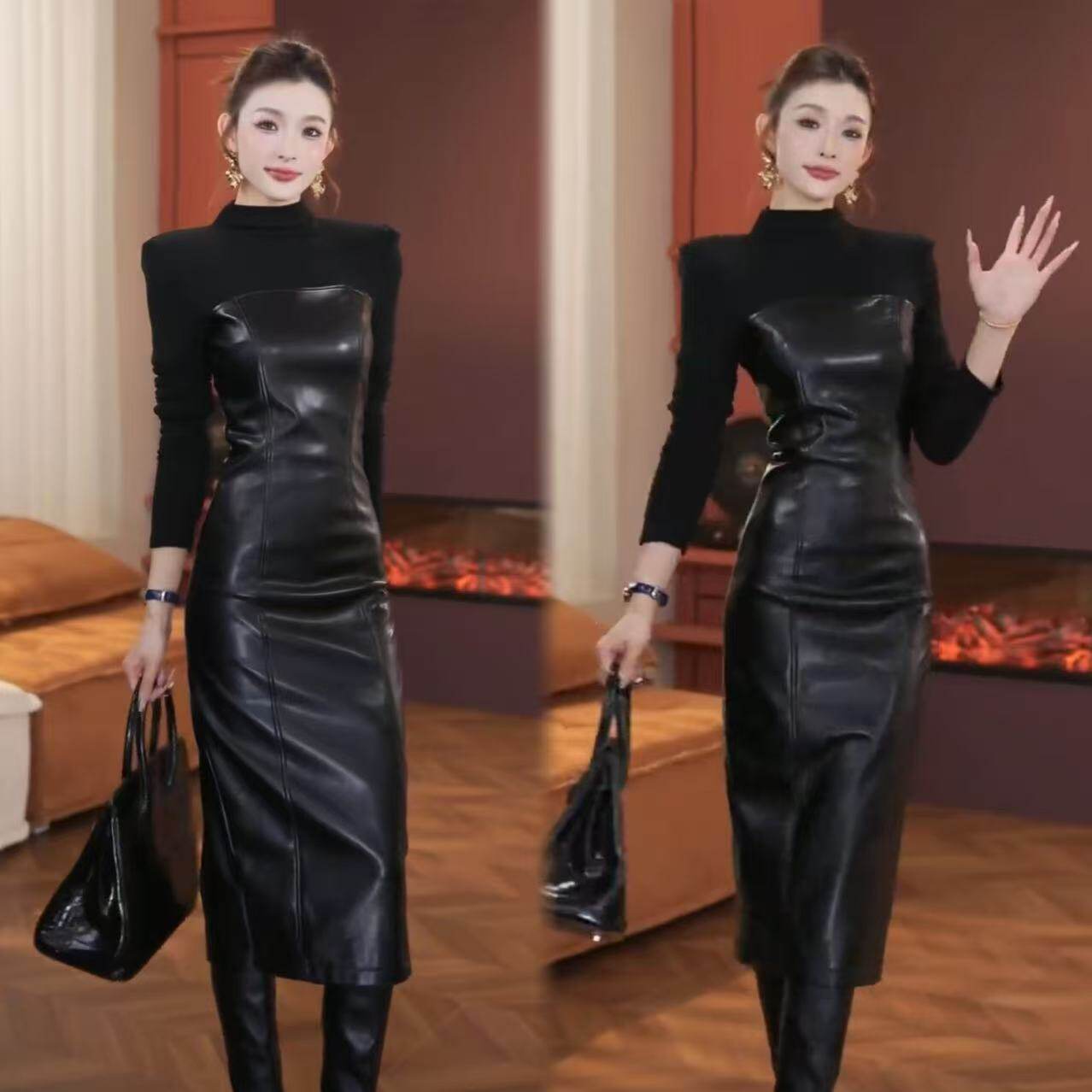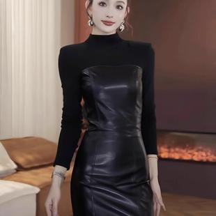 御姐轻熟风拼接皮裙连衣裙女2025秋冬新款 气质感收腰包臀显瘦短裙