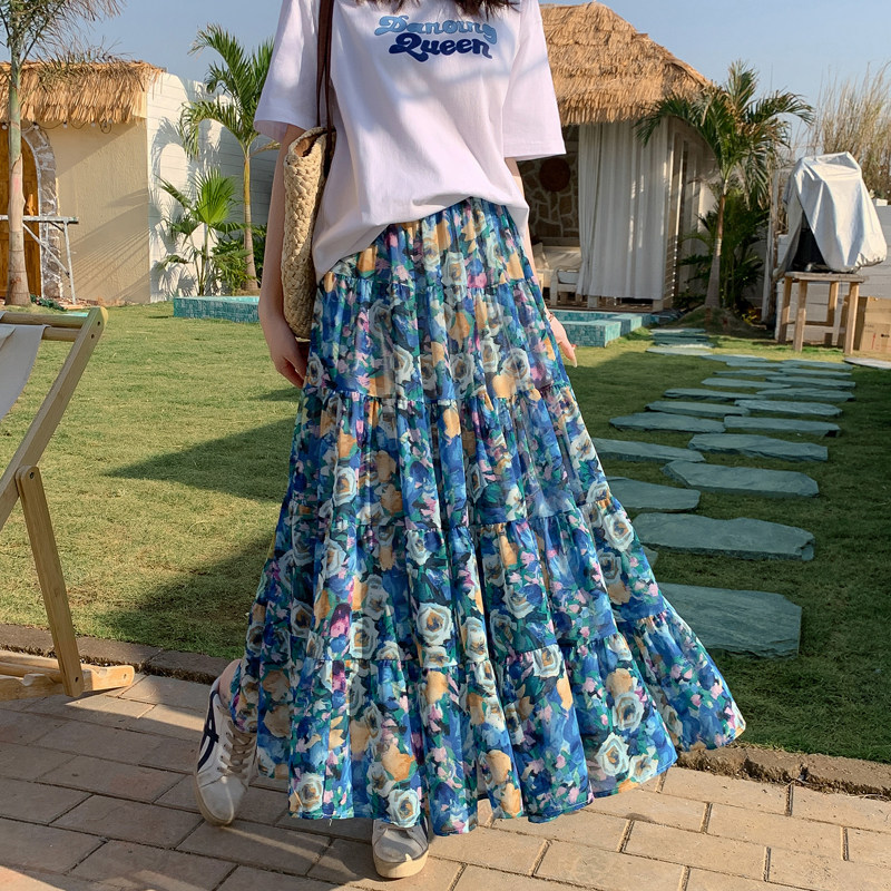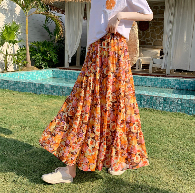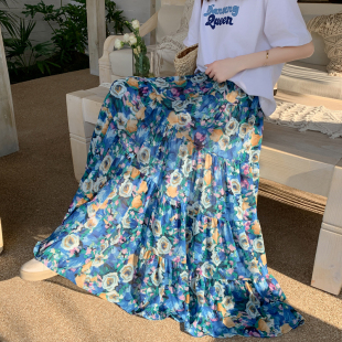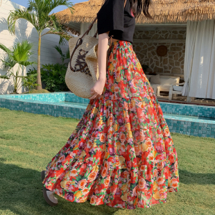波西米亚半裙女春夏2025新款 度假拼接遮跨a字蛋糕雪纺碎花半身裙