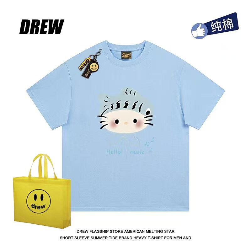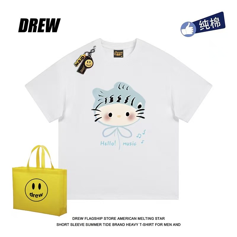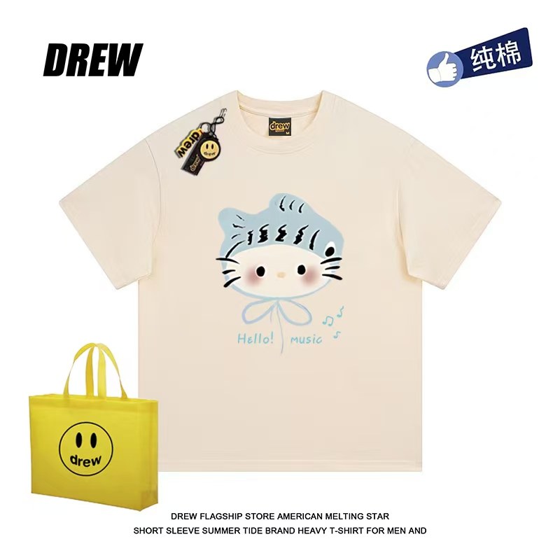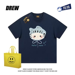 drew卡通可爱鱼头Kitty猫百搭印花休闲趣味短袖 T恤男女街头上衣
