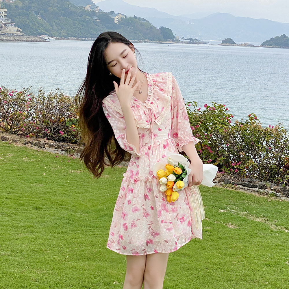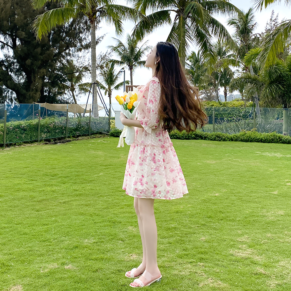 新款 夏季 小众设计感娃娃裙气质甜美裙子 茶歇碎花连衣裙女装 法式