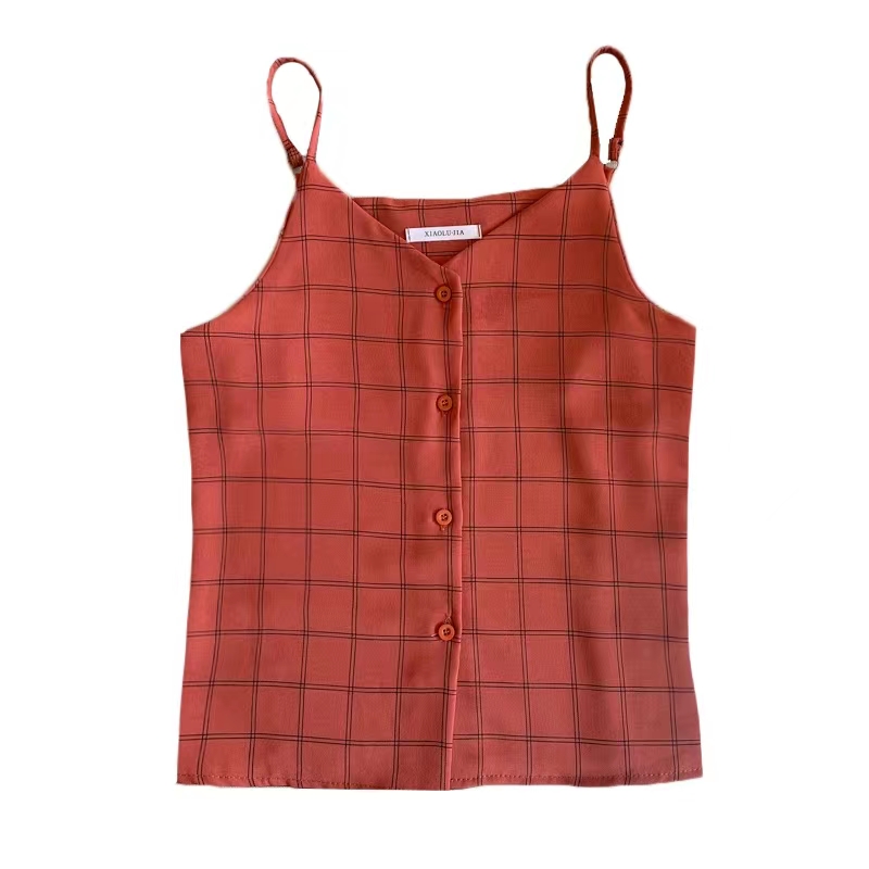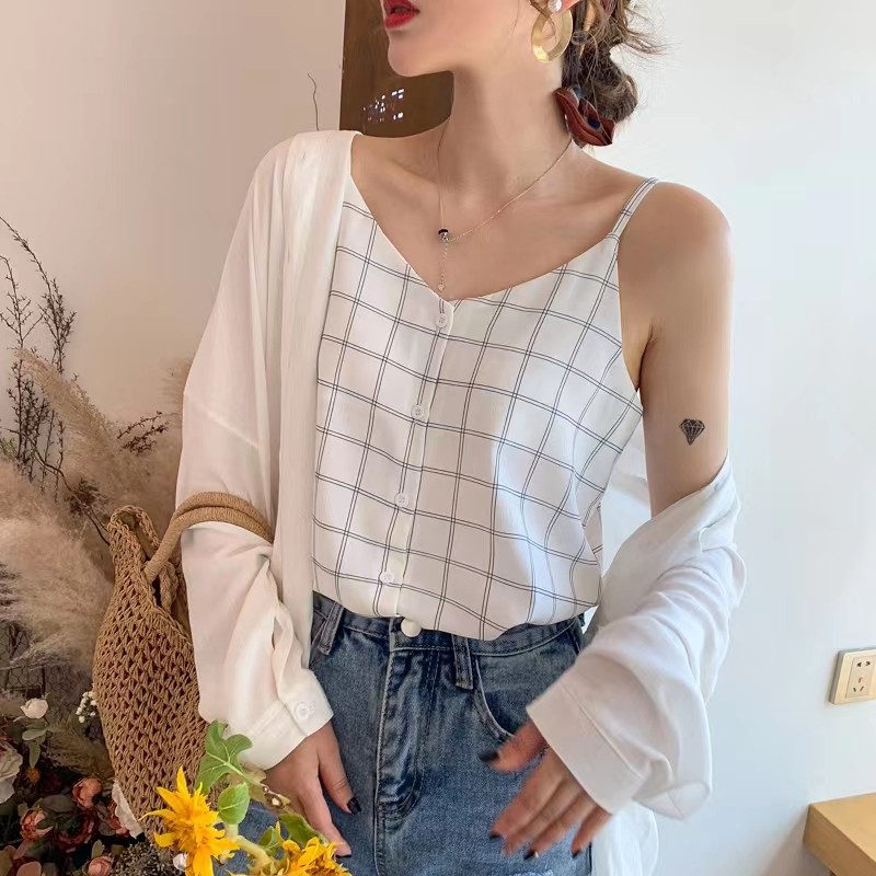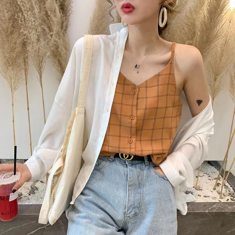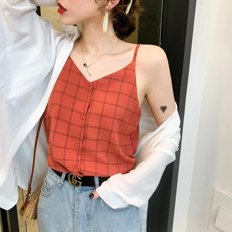 内搭性感背心女 西装 小心机雪纺无袖 吊带上衣夏外穿宽松格子打底衫
