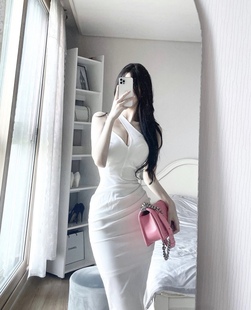 韩国江南美人性感小心机镂空斜领不对称设计感吊带高腰修身 连衣裙