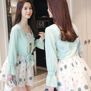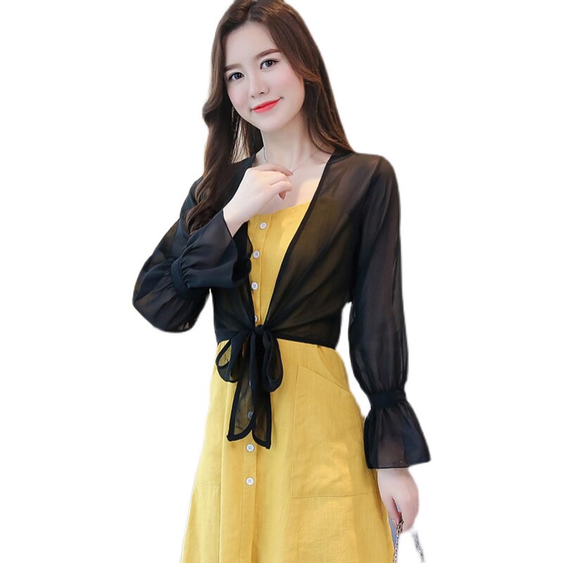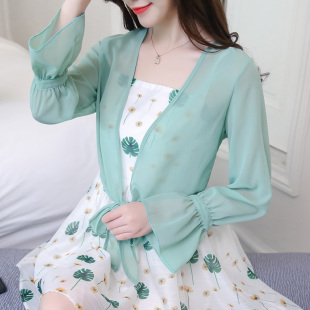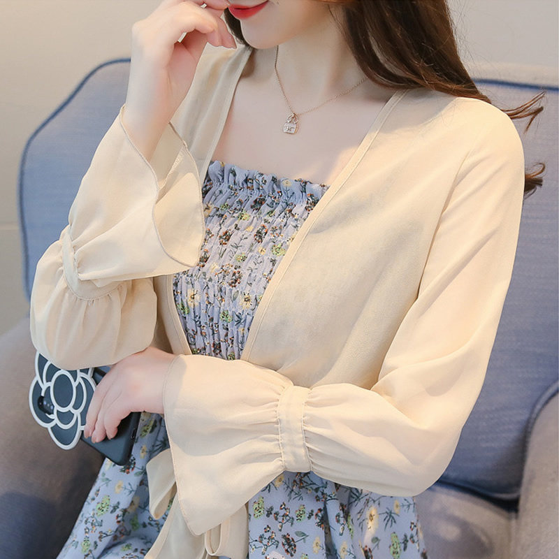 短外搭夏空调衫 女薄款 配吊带裙小披肩外套防晒衣 雪纺开衫 系带长袖