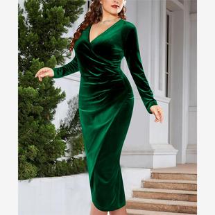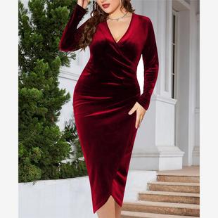 XULU原创秋冬慕斯绒褶皱包臀鱼尾裙纯色加绒气质修身 一字领连衣裙