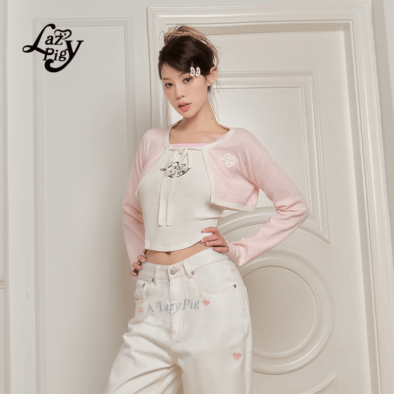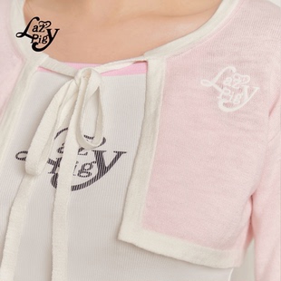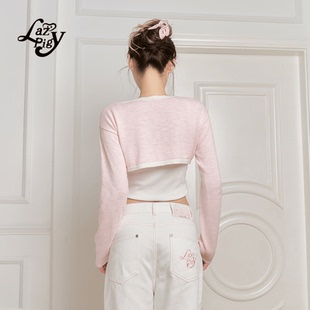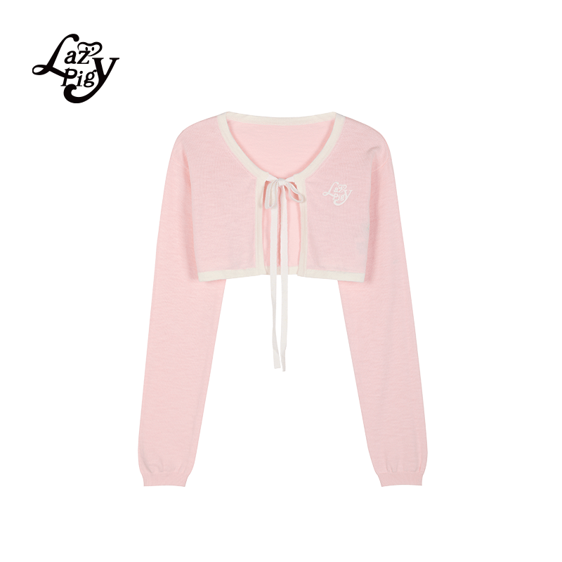 粉色甜美长袖 ALazyPig系带短款 新款 女夏季 全棉舒适短上衣 针织开衫